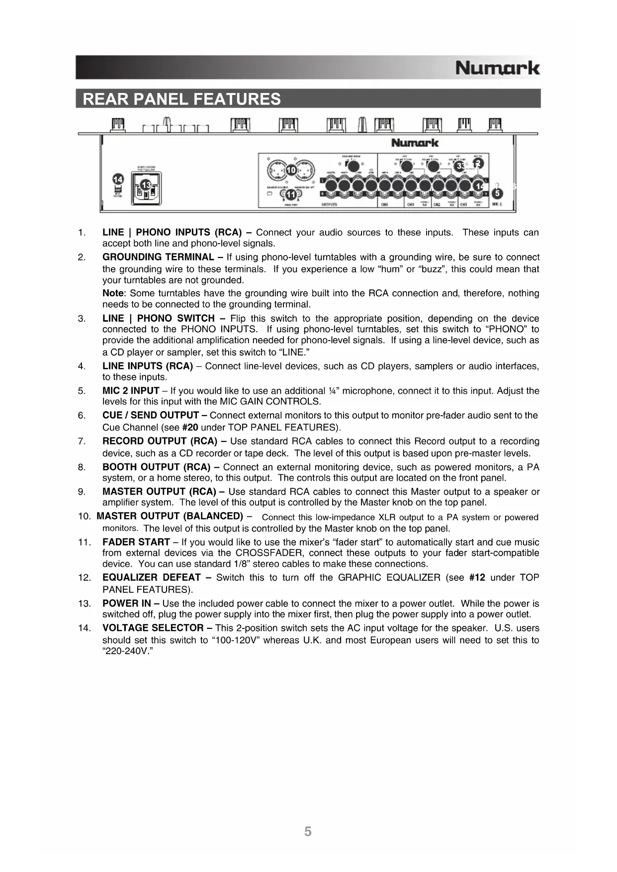 13. POWER IN – Use the included power cable to connect the mixer to a power outlet. While the power is