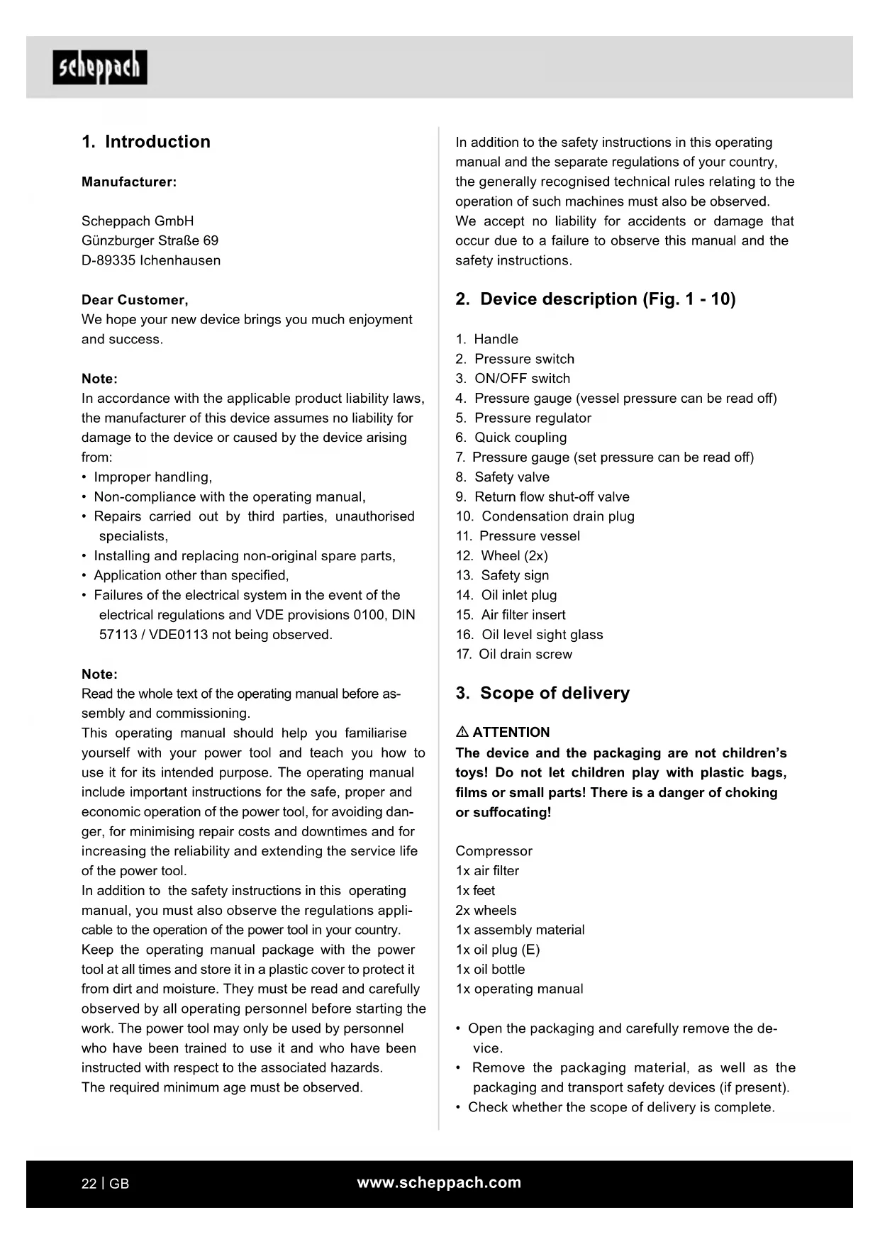 Manufacturer: Scheppach GmbH Günzburger Straße 69 D-89335 Ichenhausen Dear Customer, We hope your new device brings you much enjoyment and success. Note: In accordance with the applicable product liability laws, the manufacturer of this device assumes no liability for damage to the device or caused by the device arising from: