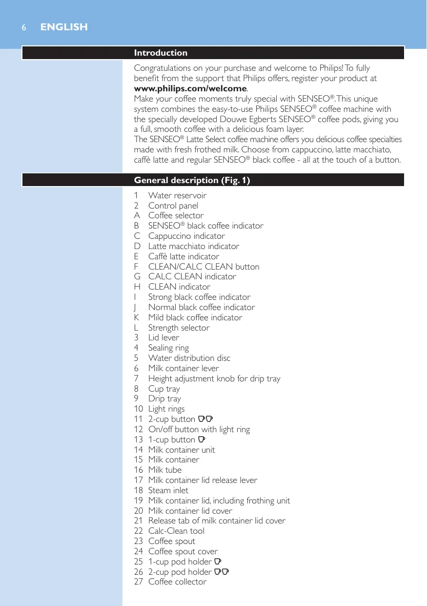 ENGLISH Introduction Congratulations on your purchase and welcome to Philips! To fully benefit from the support that Philips offers, register your product at www.philips.com/welcome. Make your coffee moments truly special with SENSEO®. This unique system combines the easy-to-use Philips SENSEO® coffee machine with the specially developed Douwe Egberts SENSEO® coffee pods, giving you a full, smooth coffee with a delicious foam layer. The SENSEO® Latte Select coffee machine offers you delicious coffee specialties made with fresh frothed milk. Choose from cappuccino, latte macchiato, caffè latte and regular SENSEO® black coffee - all at the touch of a button. General description (Fig. 1) 1 2 A B C D E F G H I J K L 3 4 5 6 7 8 9 10 11 12 13 14 15 16 17 18 19 20 21 22 23 24 25 26 27
