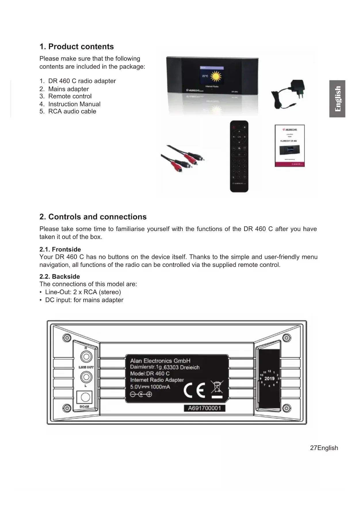 Please take some time to familiarise yourself with the functions of the DR 460 C after you have taken it out of the box. 2.1. Frontside Your DR 460 C has no buttons on the device itself. Thanks to the simple and user-friendly menu navigation, all functions of the radio can be controlled via the supplied remote control. 2.2. Backside The connections of this model are: