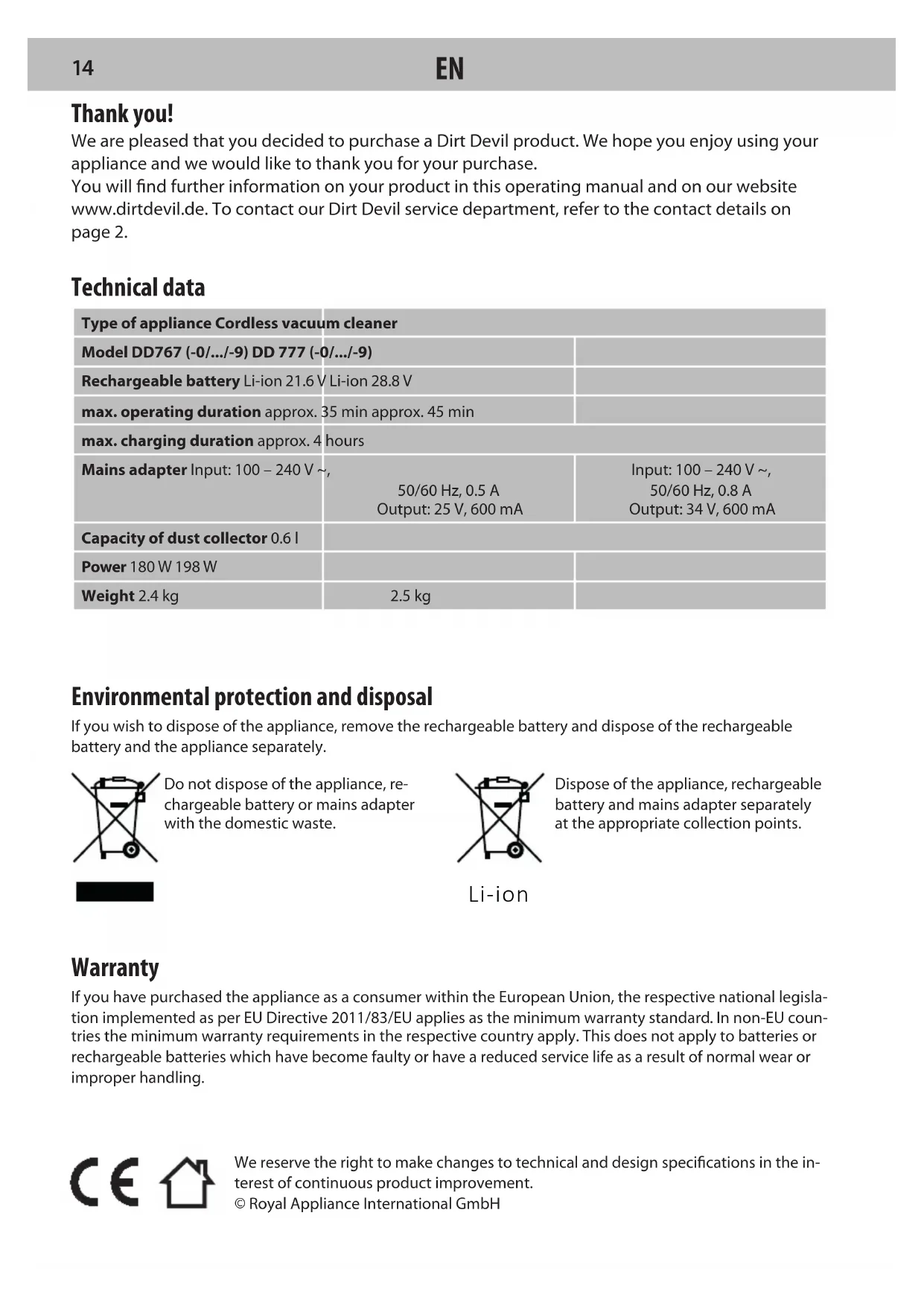 13We reserve the right to make changes to technical and design specications in the in-terest of continuous product improvement.© Royal Appliance International GmbH Technical data Type of appliance Cordless vacuum cleanerModel DD767 (-0/.../-9) DD 777 (-0/.../-9)Rechargeable battery Li-ion 21.6 V Li-ion 28.8 Vmax. operating duration approx. 35 min approx. 45 minmax. charging duration approx. 4 hoursMains adapter Input: 100 – 240 V ~, 50/60 Hz, 0.5 A Output: 25 V, 600 mAInput: 100 – 240 V ~, 50/60 Hz, 0.8 A Output: 34 V, 600 mACapacity of dust collector 0.6 lPower 180 W 198 WWeight 2.4 kg 2.5 kg Thank you! We are pleased that you decided to purchase a Dirt Devil product. We hope you enjoy using your appliance and we would like to thank you for your purchase. You will nd further information on your product in this operating manual and on our website www.dirtdevil.de. To contact our Dirt Devil service department, refer to the contact details on page 2. Environmental protection and disposal If you wish to dispose of the appliance, remove the rechargeable battery and dispose of the rechargeable battery and the appliance separately.Do not dispose of the appliance, re-chargeable battery or mains adapter with the domestic waste.Dispose of the appliance, rechargeable battery and mains adapter separately at the appropriate collection points. Warranty If you have purchased the appliance as a consumer within the European Union, the respective national legisla- tion implemented as per EU Directive 2011/83/EU applies as the minimum warranty standard. In non-EU coun- tries the minimum warranty requirements in the respective country apply. This does not apply to batteries or rechargeable batteries which have become faulty or have a reduced service life as a result of normal wear or improper handling. Li-ion
