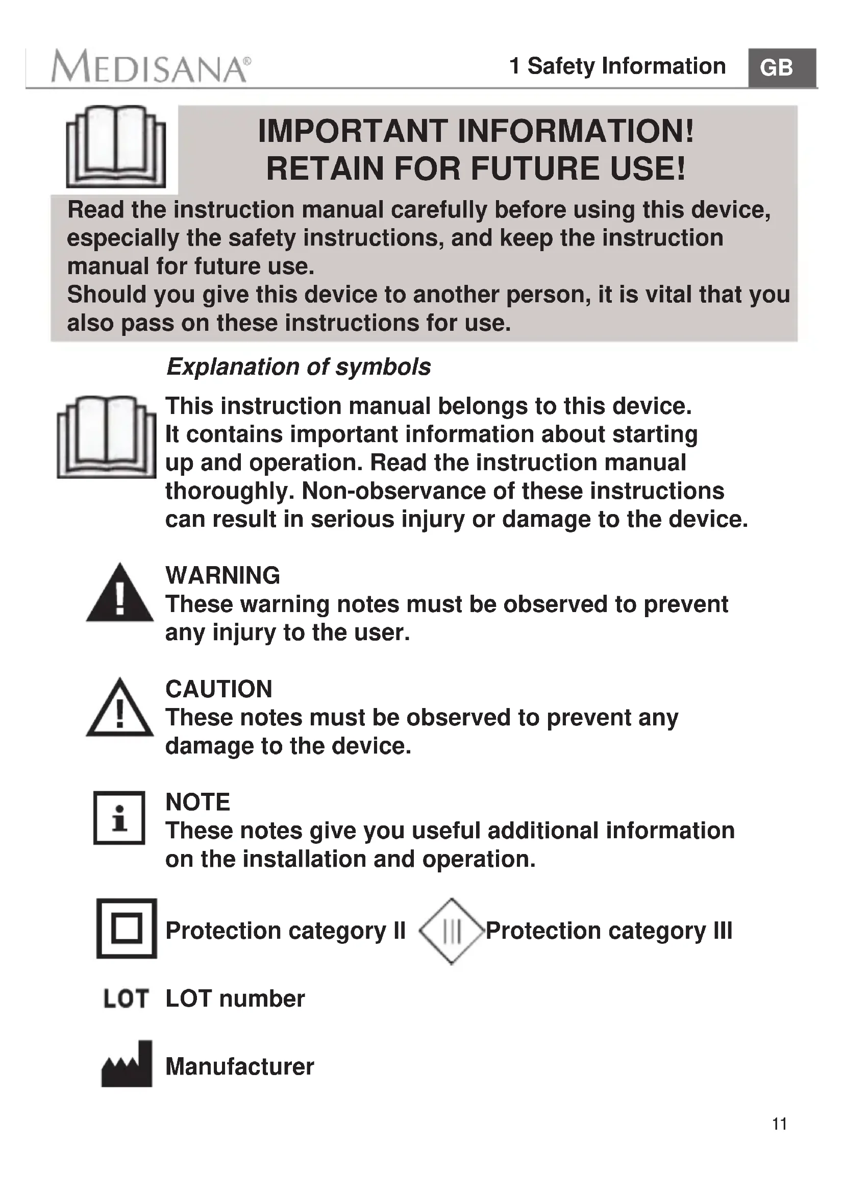 Explanation of symbols This instruction manual belongs to this device. It contains important information about starting up and operation. Read the instruction manual thoroughly. Non-observance of these instructions can result in serious injury or damage to the device. WARNING These warning notes must be observed to prevent any injury to the user. CAUTION These notes must be observed to prevent any damage to the device. NOTE These notes give you useful additional information on the installation and operation. Protection category II Protection category III LOT number Manufacturer IMPORTANT INFORMATION! RETAIN FOR FUTURE USE! Read the instruction manual carefully before using this device, especially the safety instructions, and keep the instruction manual for future use. Should you give this device to another person, it is vital that you also pass on these instructions for use.12 1 Safety Information