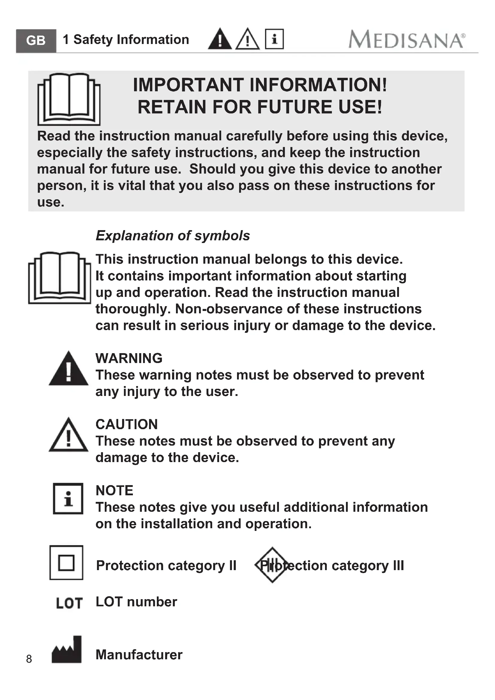 - If the power supply cable, respectively the mains adaptor is damaged, it may only be replaced by MEDISANA, an authorised dealer or by qualified personnel.