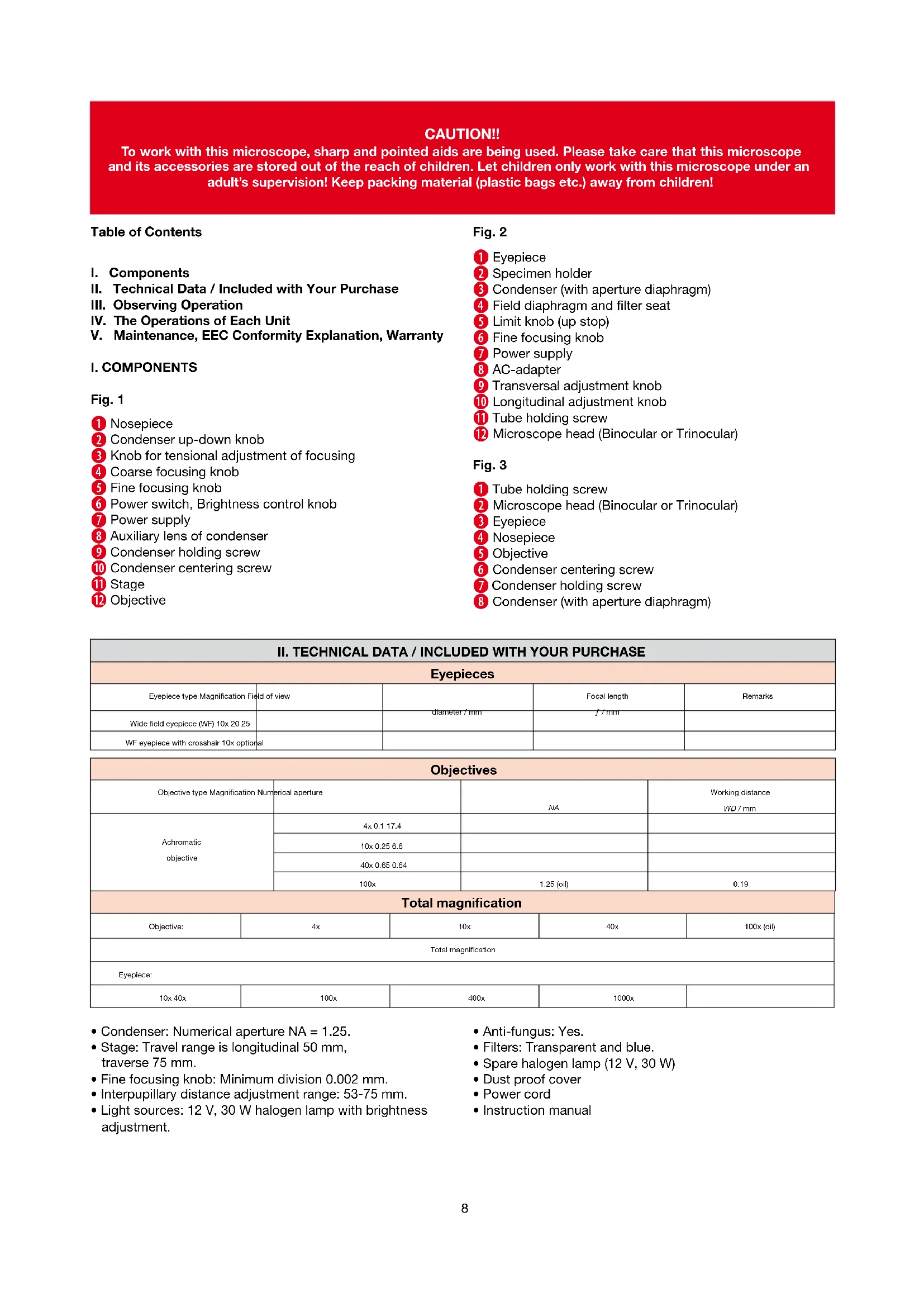 CAUTION!! To work with this microscope, sharp and pointed aids are being used. Please take care that this microscope and its accessories are stored out of the reach of children. Let children only work with this microscope under an adult’s supervision! Keep packing material (plastic bags etc.) away from children! Objective: 4x 10x 40x 100x (oil) Total magnification Eyepiece: 10x 40x 100x 400x 1000x Total magnification9