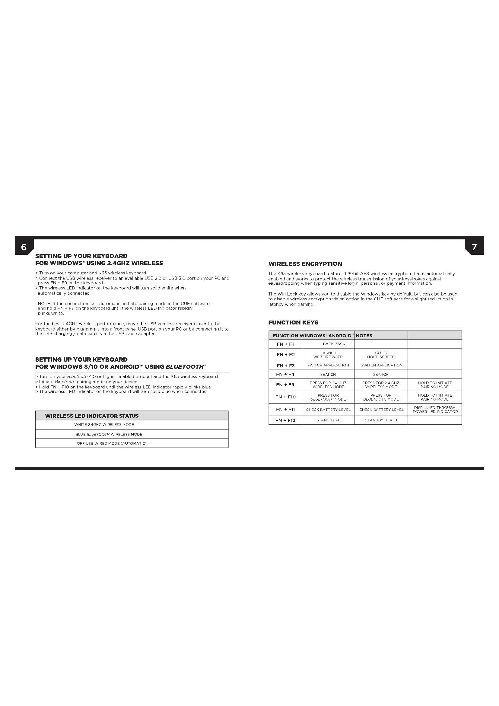 JP PK M ON6 7 > Turn on your computer and K63 wireless keyboard > Connect the USB wireless receiver to an available USB 2.0 or USB 3.0 port on your PC and press FN + F9 on the keyboard > The wireless LED indicator on the keyboard will turn solid white when automatically connected NOTE: If the connection isn’t automatic, initiate pairing mode in the CUE software and hold FN + F9 on the keyboard until the wireless LED indicator rapidly blinks white. For the best 2.4GHz wireless performance, move the USB wireless receiver closer to the keyboard either by plugging it into a front panel USB port on your PC or by connecting it to the USB charging / data cable via the USB cable adapter. > Turn on your Bluetooth 4.0 or higher enabled product and the K63 wireless keyboard > Initiate Bluetooth pairing mode on your device > Hold FN + F10 on the keyboard until the wireless LED indicator rapidly blinks blue > The wireless LED indicator on the keyboard will turn solid blue when connected