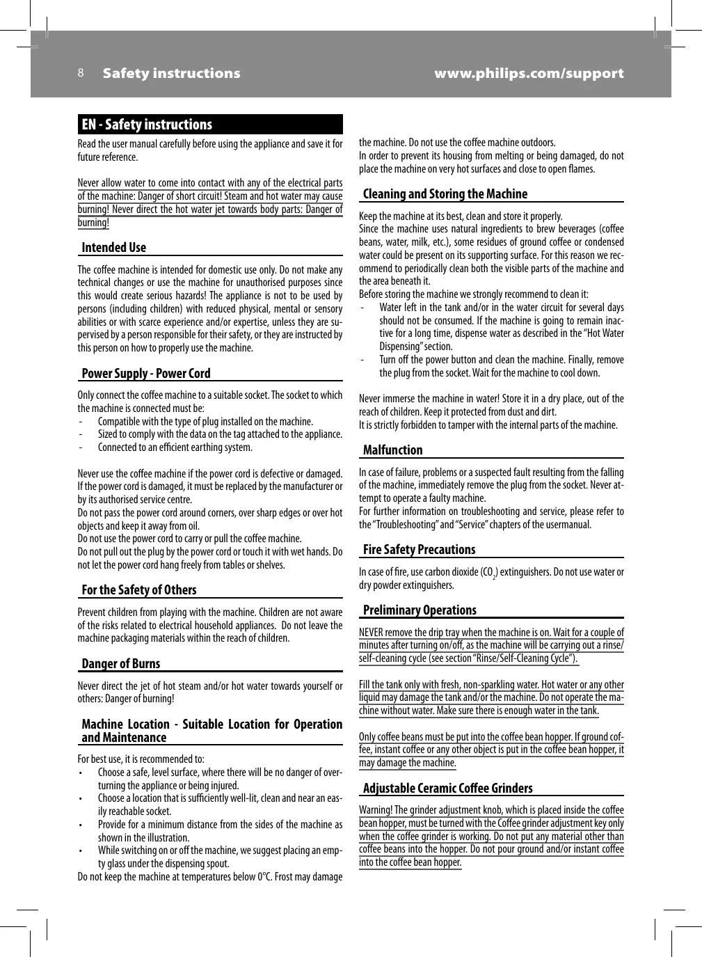 EN - Safety instructions Read the user manual carefully before using the appliance and save it for future reference. Never allow water to come into contact with any of the electrical parts of the machine: Danger of short circuit! Steam and hot water may cause burning! Never direct the hot water jet towards body parts: Danger of burning!