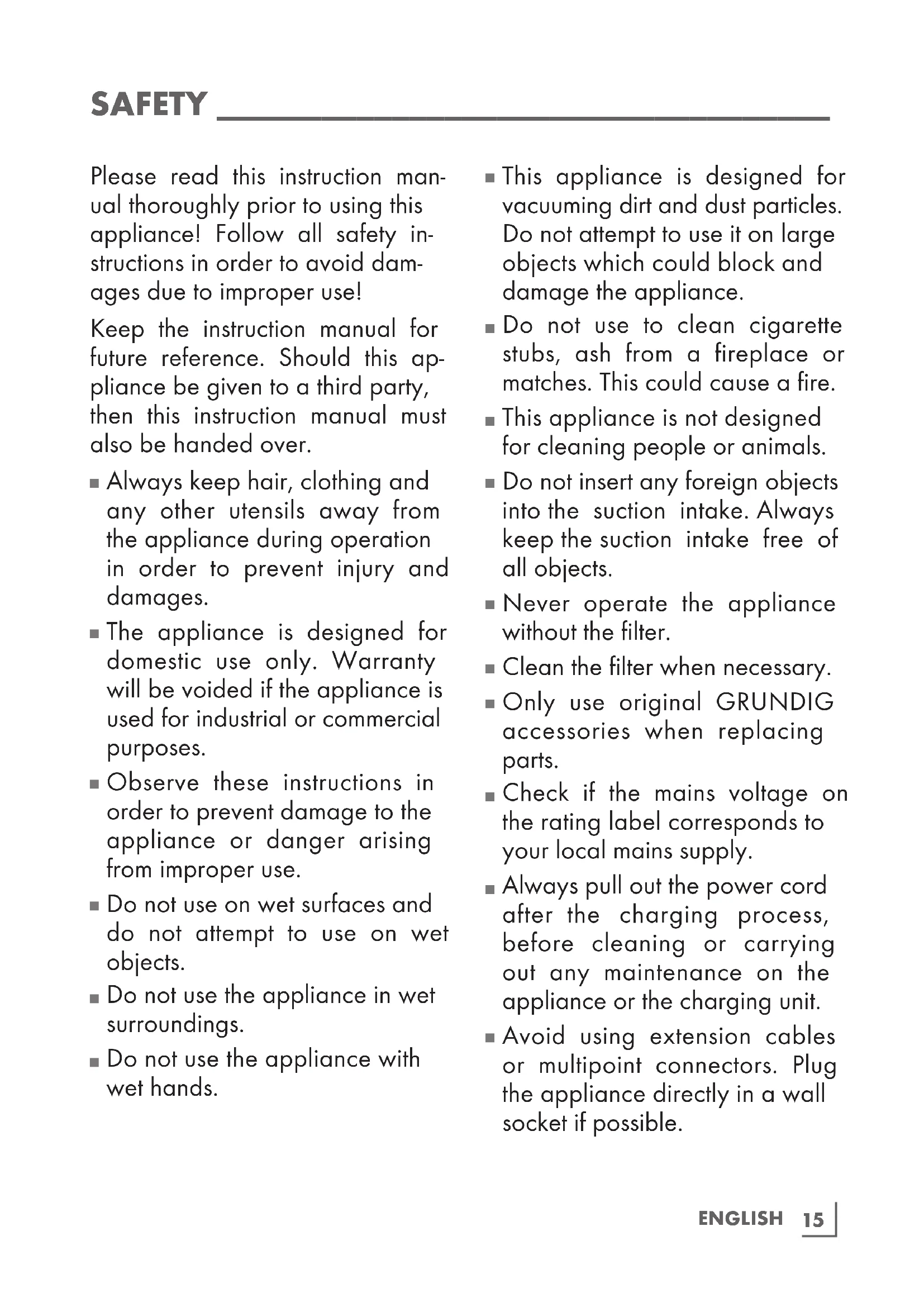 Only use the power cord provided.17 ENGLISH OVERVIEW ________________________________ Dear Customer, Congratulations on the purchase of your new GRUNDIG 2 in 1 rechargeable vertical vacuum cleaner VCH 9630-VCH 9631-VCH 9632. Please read the following user notes carefully so that you can enjoy your quality Grundig product for many years to come. A responsible approach! GRUNDIG focuses on contractually agreed social working conditions with fair wages for both internal employees and suppliers, as well as on the efficient use of raw materials with continual waste reduction of several tonnes of plastic each year – and availability of at least 5 years for all accessories. For a future worth living. For a good reason. Grundig. HEPA filter HEPA stands for High Efficiency Particulate Air. HEPA filters are particulate air filters, which filter more than 99.9% of all dust particles larger than