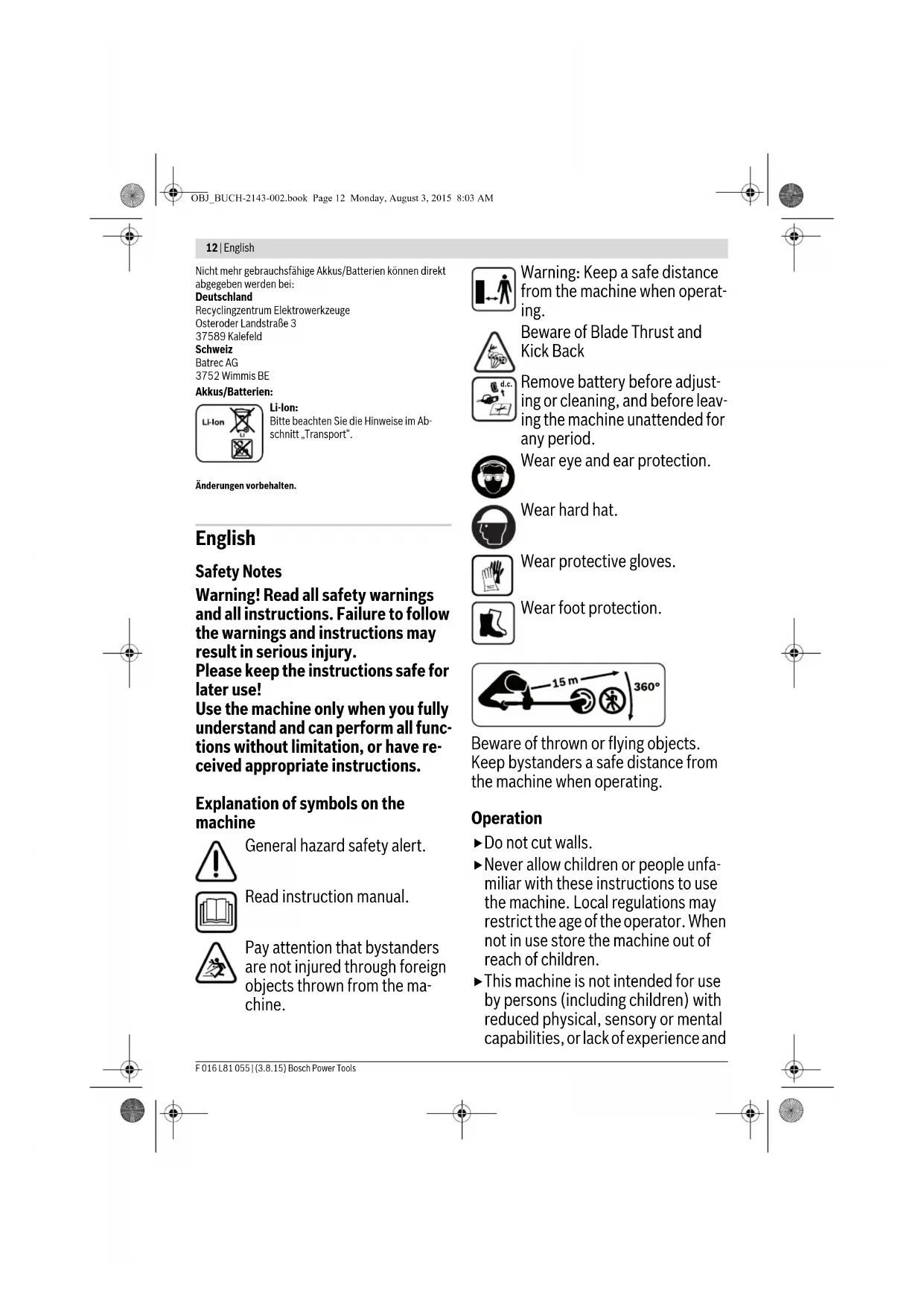 from the machine when operat- ing. Beware of Blade Thrust and Kick Back Remove battery before adjust- ing or cleaning, and before leav- ing the machine unattended for any period. Wear eye and ear protection. Wear hard hat. Wear protective gloves. Wear foot protection. Beware of thrown or flying objects. Keep bystanders a safe distance from the machine when operating. Operation Do not cut walls. Never allow children or people unfa- miliar with these instructions to use the machine. Local regulations may restrict the age of the operator. When not in use store the machine out of reach of children. This machine is not intended for use by persons (including children) with reduced physical, sensory or mental capabilities, or lack of experience and d.c. OBJ_BUCH-2143-002.book Page 12 Monday, August 3, 2015 8:03 AMEnglish | 13 Bosch Power Tools F 016 L81 055 | (3.8.15) knowledge, unless they have been given supervision or instruction con- cerning use of the machine by a per- son responsible for their safety. Children should be supervised to en- sure that they do not play with the machine. Never work while people, especially children, or pets are nearby. The operator or user is responsible for accidents or hazards occurring to other people or their property. Do not operate the machine when barefoot or wearing open sandals, al- ways wear substantial footwear and long trousers. Thoroughly inspect the area where the machine is to be used and remove all stones, sticks, wires, bones and other foreign objects. Do not operate in areas where live ca- bles may be present. Before using, always visually inspect to see that the blade, blade nut and cutter assembly are not worn or dam- aged. Replace worn or damaged blade and nut in sets to preserve balance. Work only in daylight or in good artifi- cial light. Avoid operating the machine in bad weather conditions especially when there is a risk of lightning. For your safety, please take care whilst operating the machine in wet grass. Walk, never run and stay in a stable position. Keep firm footing and balance. Do not overreach. Always wear ear and eye protection when operating the machine. Never operate the machine with missing or broken guards or shields or without guards or shields in posi- tion. Always check for signs of wear or damage before and after use. Never operate the product when you are tired, ill or under the influence of alcohol, drugs or medicine. Working on banks can be danger- ous. – Do not work on excessively steep slopes. – Always be sure of your footing on slopes or wet grass. – Work across the face of slopes – never up and down. – Exercise extreme caution when changing direction on slopes. Keep hands and feet away from the cutting means at all times, especially when switching on the motor. Wait until the cutting head has com- pletely stopped before touching it. The head continues to rotate after the machine is switched off, the cutting system can cause injury/damage. Take care against injury from any de- vice fitted for trimming the filament line length. After extending new cut- ter line always return the machine to its normal operating position before switching on. OBJ_BUCH-2143-002.book Page 13 Monday, August 3, 2015 8:03 AM14 | English F 016 L81 055 | (3.8.15) Bosch Power Tools Switch off when transporting the ma- chine to and from the area to be worked on. Switch off and remove the battery from the battery cartridge: – whenever you leave the machine unattended for any period, – before clearing a blockage, – before replacing the cutting head, – before checking, cleaning or work- ing on the machine, – after striking a foreign object. In- spect the machine for damage and make repairs as necessary, – if the machine starts to vibrate ab- normally (check immediately). Do not modify this product. Unau- thorized modifications may impair the safety of your product and may result in increased noise and vibra- tion. Only use Bosch Professional Garden Tool recommended and approved ac- cessories. Beware that the tool may kick back when a blade suddenly strikes a hard object when cutting brush or scrub vegetation. Take care to minimise the effects of kick back. This tool is designed to be used with the shoulder harness provided. Take care to adjust the harness to balance the tool correctly and reduce the po- tential for operator fatigue in use. For Transport and Storage, Blade should be protected using an appri- ate cover. Maintenance For Your Safety