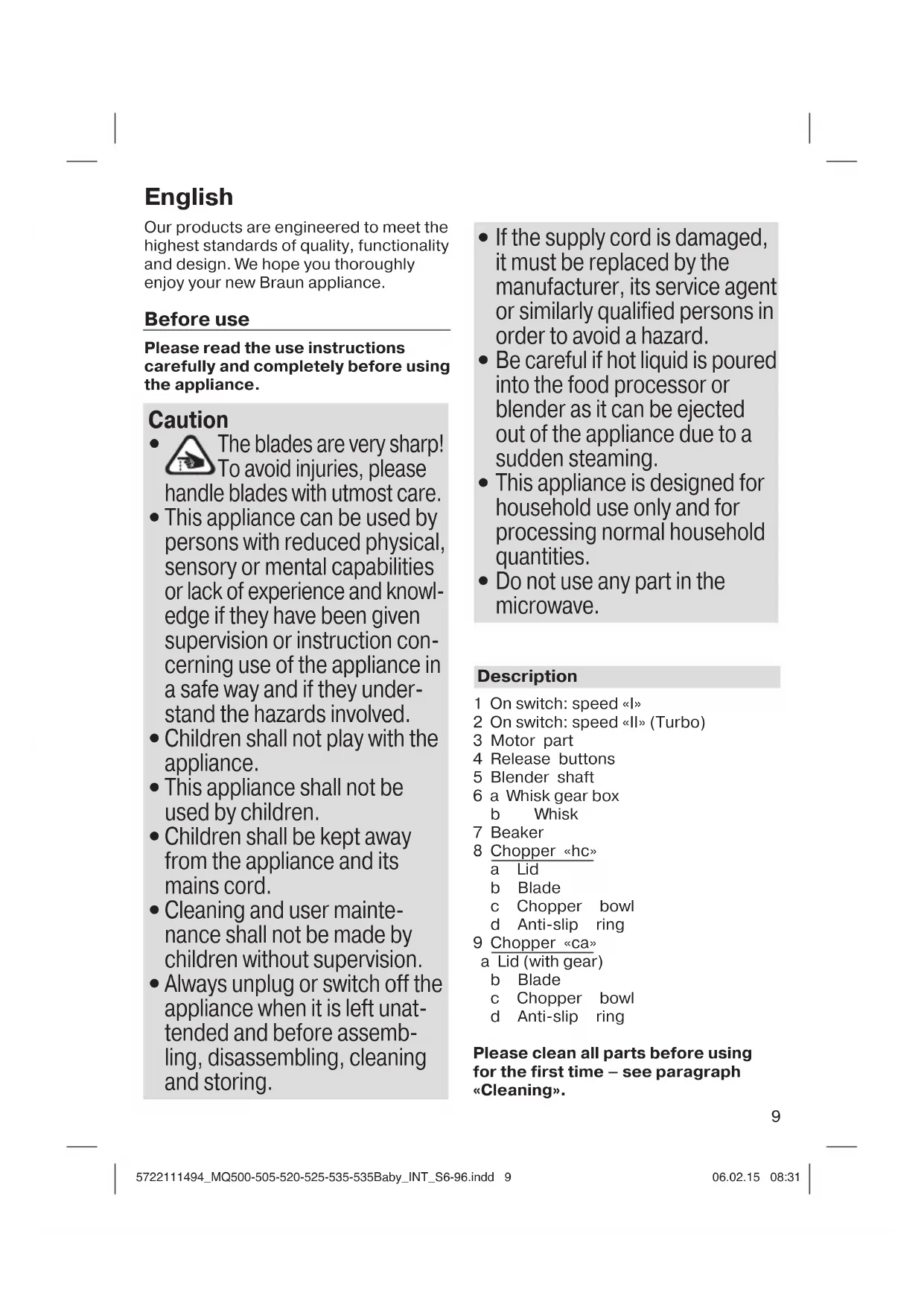 remove the processed food. To remove the blade, slightly turn and pull it off. Recipe example: Vanilla-Honey-Prunes (as pancake stuffing or spread) Place 40 g prunes and 40 g creamy honey in the «hc» chopper bowl. Operate 4 seconds using speed «II». Then add 10 ml water (vanilla-flavoured) and resume chopping for another second. Cleaning (see D) Clean the motor part (3) and the whisk gear box (6a) with a damp cloth only. Clean the «ca» chopper lid (9a) only under running water. Do not place it in the dishwasher. All other parts can be cleaned in a dish- washer. You may remove the anti-slip rings from the chopper bowls for extra thorough cleaning. When processing foods with high pigment content (e.g. carrots), the accessories may become discoloured. Wipe these parts with vegetable oil before cleaning them. Accessories (can be bought individually, not available in every country) MQ 10: Whisk for beating cream, egg-whites, ready-mix desserts. MQ 20: 350 ml compact chopper to chop herbs, onions, garlic, chillies, nuts etc. MQ 40: 1250 ml chopper to chop, mix, blend and crush ice. MQ 70: Compact kitchen machine accessory to chop, mix, slice and shred. Kneading function not available with Multiquick 5. Subject to change without notice. Please do not dispose of the product in the household waste at the end of its useful life. Disposal can take place at a Braun Service Centre or at appropriate collection points provided in your country. For UK Only Guarantee Information All Braun Household products carry a minimum guarantee period of two years. The rights and benefits under this guarantee are additional to your statutory rights which are not affected. Please keep your receipt as this will form the basis of your guarantee. In the unlikely event of a breakdown you have access to professional help from our team simply by calling: