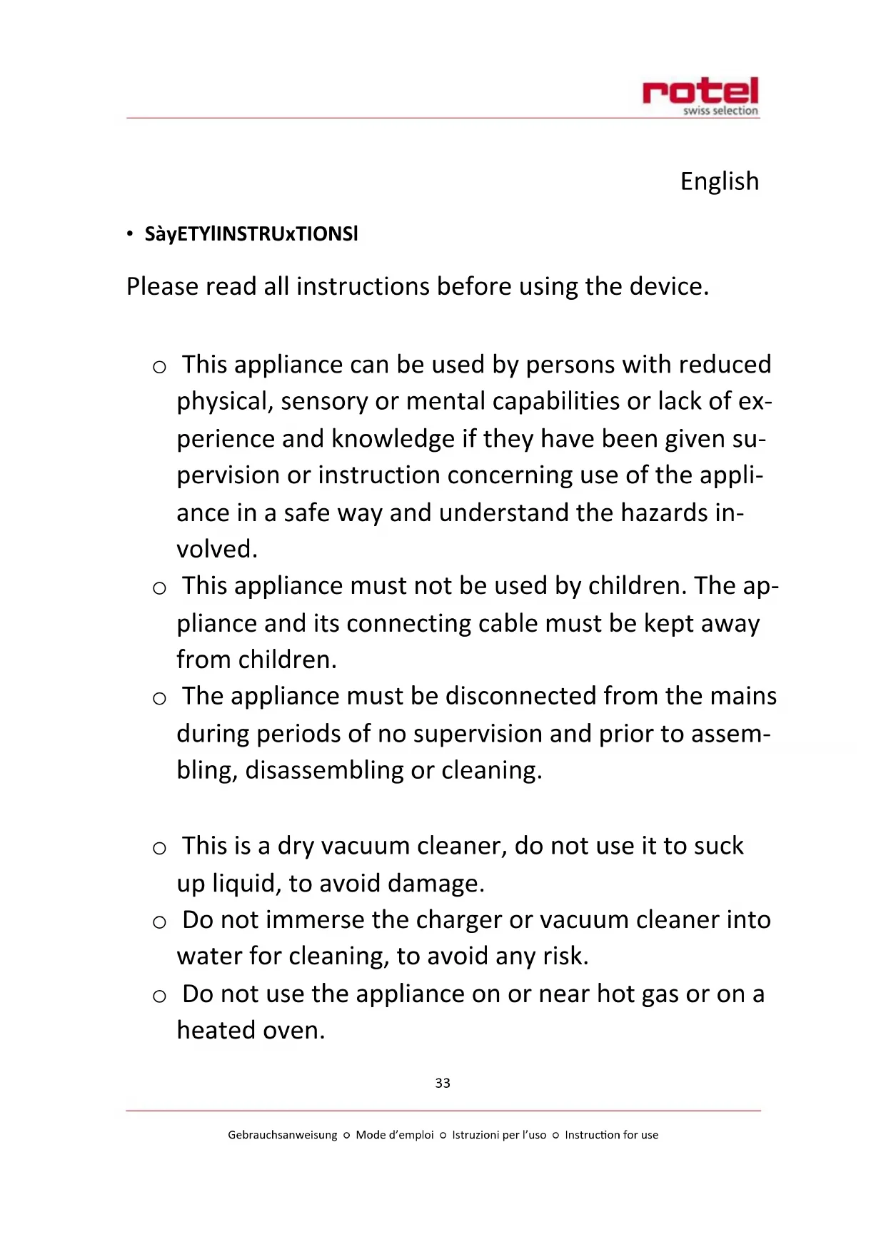 ○ This appliance must not be used by children. The appliance and its connecting cable must be kept away from children.
