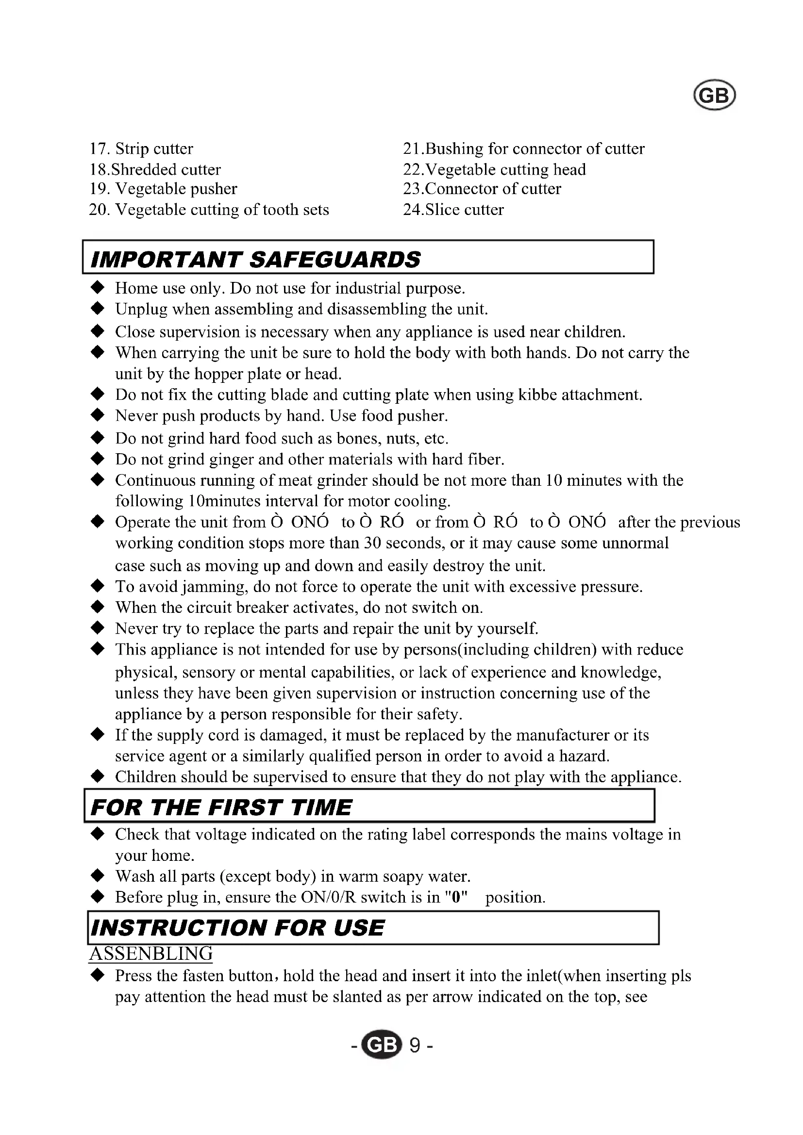 ◆ Continuous running of meat grinder should be not more than 10 minutes with the following 10minutes interval for motor cooling.