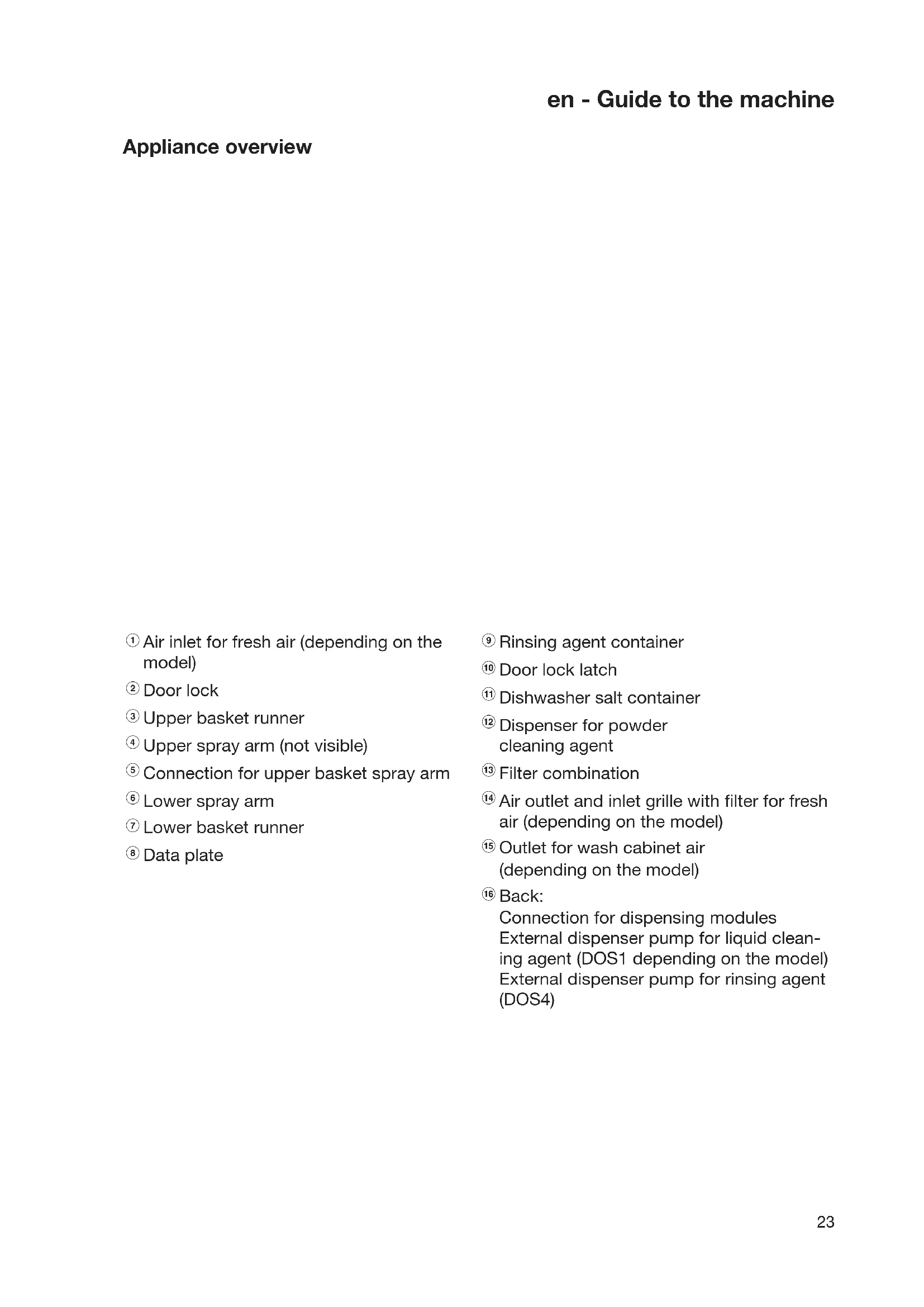 Back: Connection for dispensing modules External dispenser pump for liquid clean- ing agent (DOS1 depending on the model) External dispenser pump for rinsing agent (DOS4)en - Guide to the machine