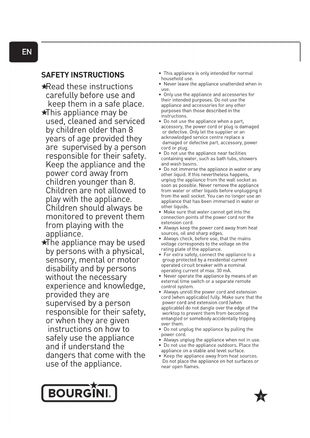 6NL 7SAFETY INSTRUCTIONS Read these instructions carefully before use and keep them in a safe place. This appliance may be used, cleaned and serviced by children older than 8 years of age provided they are supervised by a person responsible for their safety. Keep the appliance and the power cord away from children younger than 8. Children are not allowed to play with the appliance. Children should always be monitored to prevent them from playing with the appliance. The appliance may be used by persons with a physical, sensory, mental or motor disability and by persons without the necessary experience and knowledge, provided they are supervised by a person responsible for their safety, or when they are given instructions on how to safely use the appliance and if understand the dangers that come with the use of the appliance.