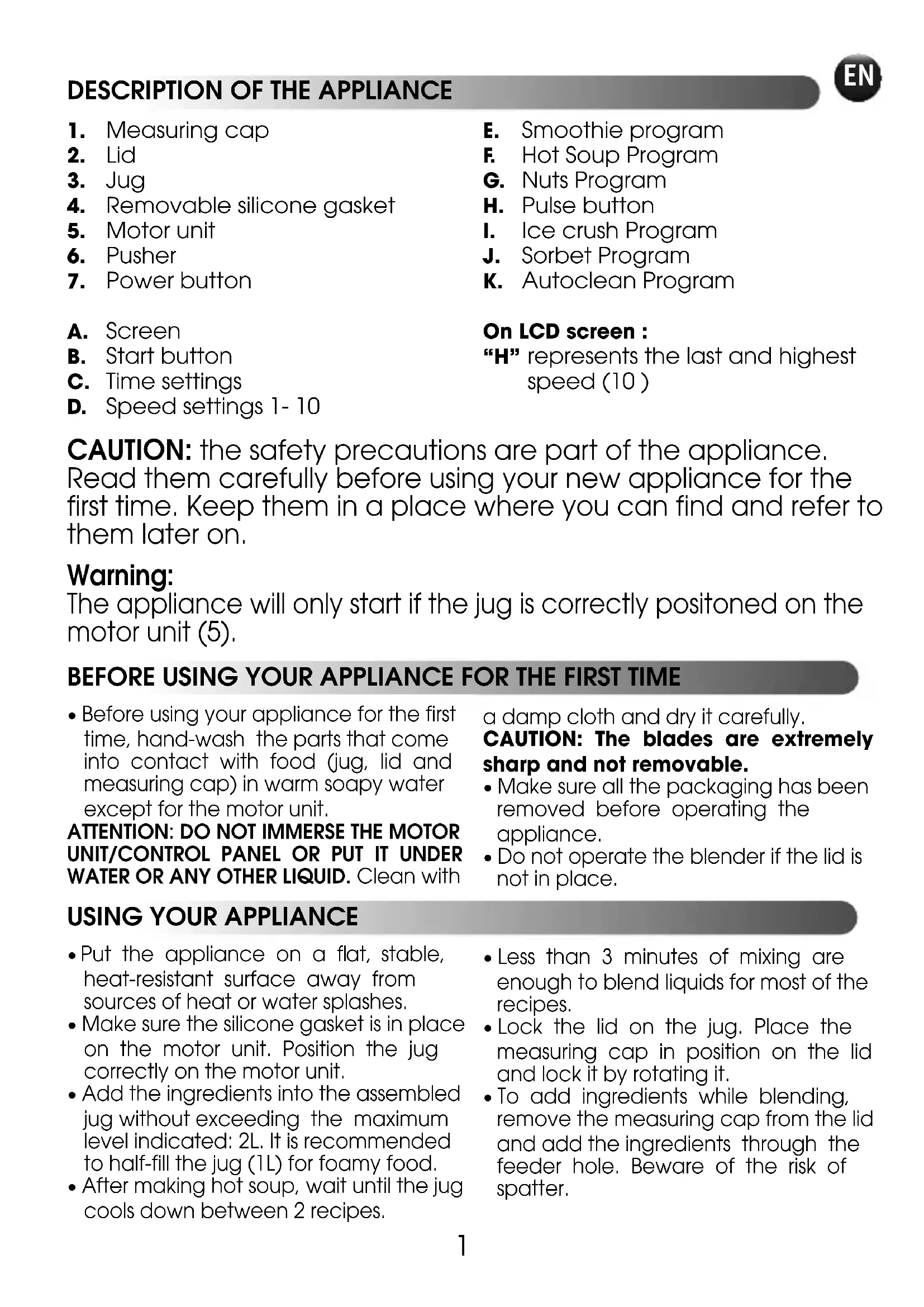 - Do not operate the blender if the lid is not in place. CAUTION: the safety precautions are part of the appliance. Read them carefully before using your new appliance for the first time. Keep them in a place where you can find and refer to them later on.