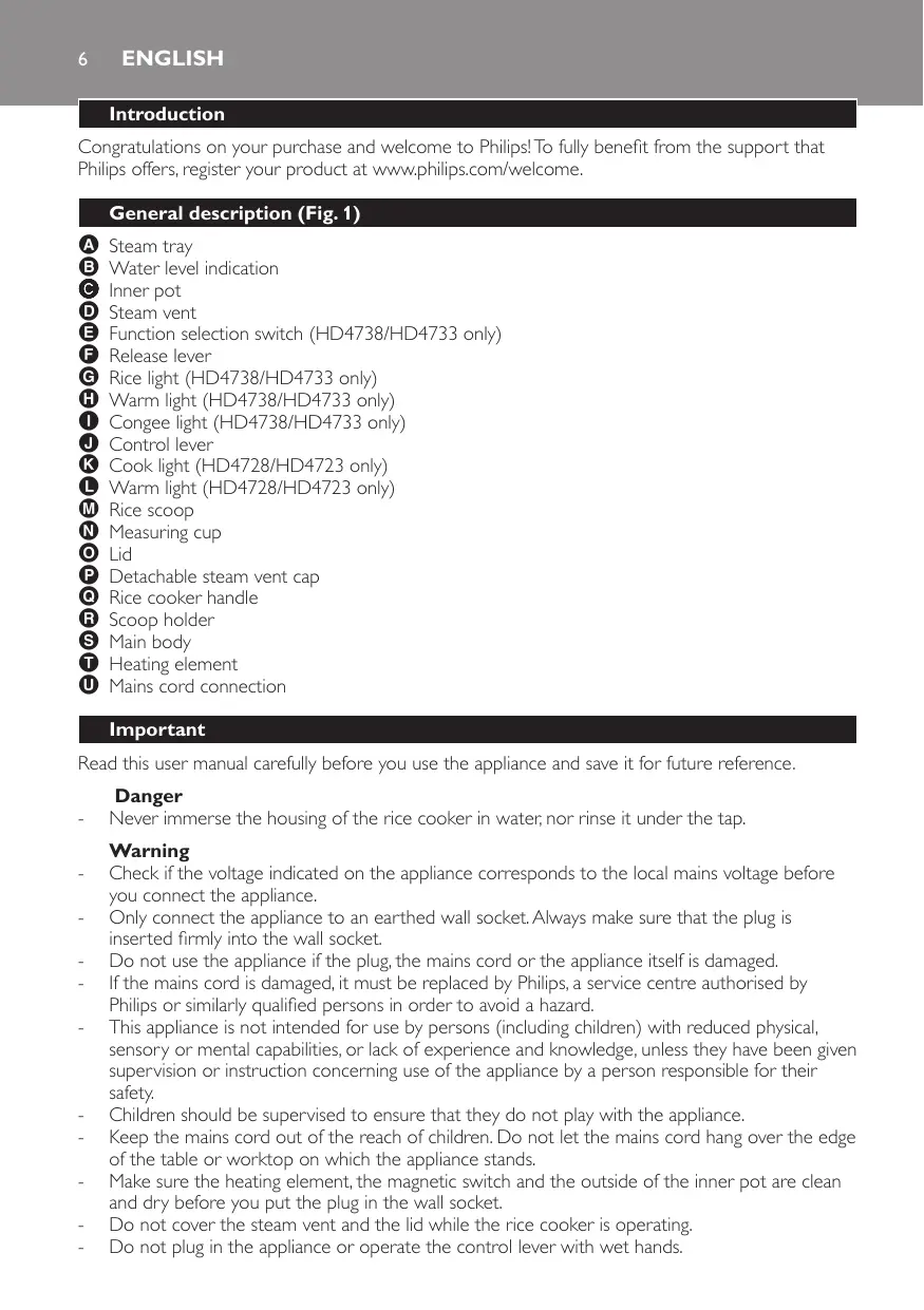 - This appliance is intended for household use only. If the appliance is used improperly or for professional or semi-professional purposes or if it is not used according to the instructions in this user manual, the guarantee becomes invalid and Philips refuses liability for any damage caused.