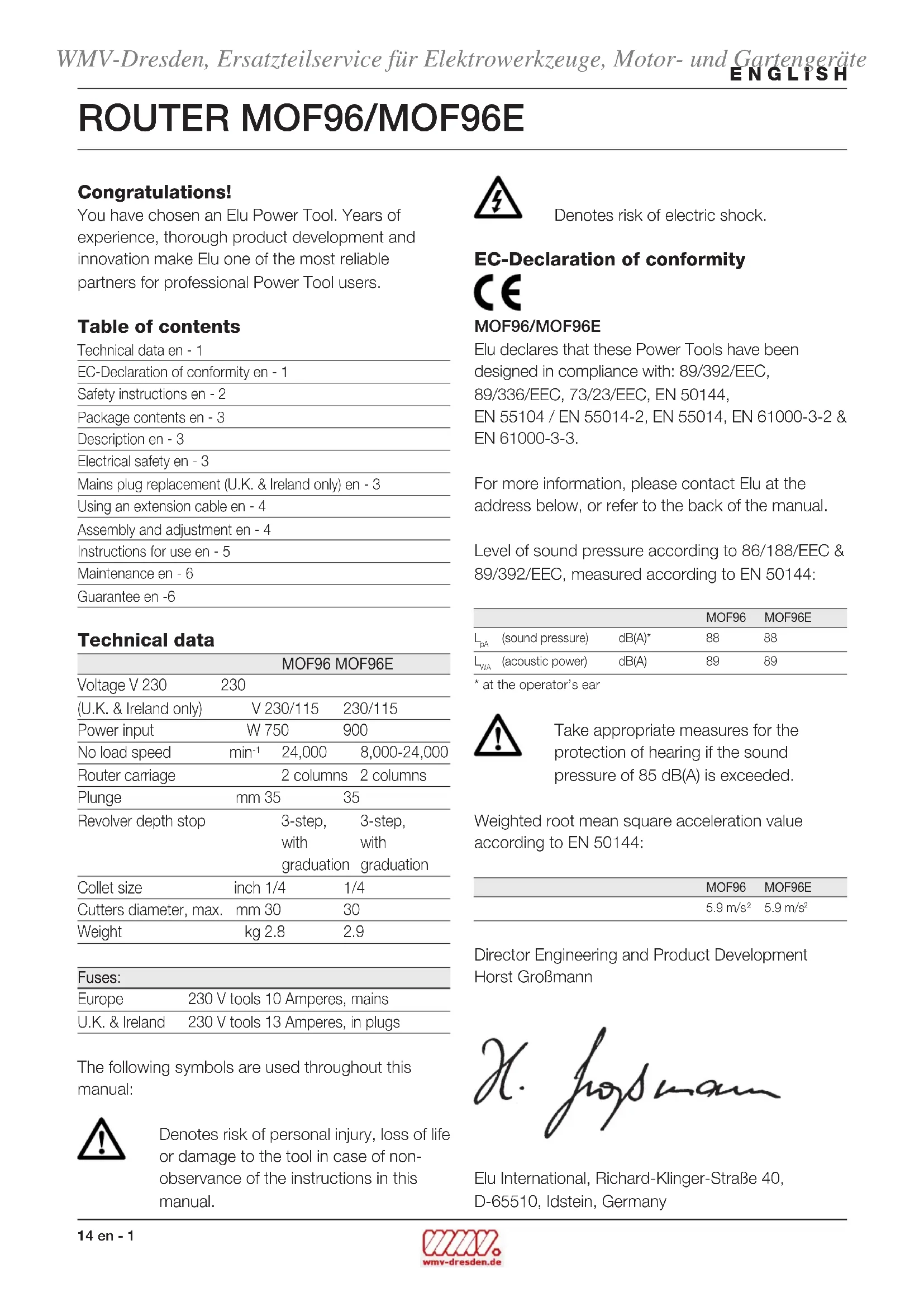 Director Engineering and Product Development Horst Großmann Elu International, Richard-Klinger-Straße 40, D-65510, Idstein, Germany WMV-Dresden, Ersatzteilservice für Elektrowerkzeuge, Motor- und Gartengeräteen - 2 15 ENGLISH Safety instructions When using Power Tools, always observe the safety regulations applicable in your country to reduce the risk of fire, electric shock and personal injury. Read the following safety instructions before attempting to operate this product. Keep these instructions in a safe place! General 1 Keep work area clean Cluttered areas and benches can cause accidents. 2 Consider work area environment Do not expose Power Tools to humidity. Keep work area well lit. Do not use Power Tools in the presence of flammable liquids or gases. 3 Guard against electric shock Prevent body contact with earthed surfaces (e.g. pipes, radiators, cookers and refrigerators). For use under extreme conditions (e.g. high humidity, when metal swarf is being produced, etc.) electric safety can be improved by inserting an isolating transformer or a (FI) earth- leakage circuit-breaker. 4 Keep children away Do not let children come into contact with the tool or extension cord. Supervision is required for those under 16 years of age. 5 Extension cords for outdoor use When the tool is used outdoors, always use extension cords intended for outdoor use and marked accordingly. 6 Store idle tools When not in use, Power Tools must be stored in a dry place and locked up securely, out of reach of children. 7 Dress properly Do not wear loose clothing or jewellery. They can be caught in moving parts. Preferablywear rubber gloves and non-slip footwear when working outdoors. Wear protective hair covering to keep long hair out of the way. 8 Wear safety goggles Also use a face or dust mask in case the operations produce dust or flying particles. 9 Beware of maximum sound pressure Take appropriate measures for the protection of hearing if the sound pressure of 85 dB(A) is exceeded. 10 Secure workpiece Use clamps or a vice to hold the workpiece. It is safer and it frees both hands to operate the tool. 11 Do not overreach Keep proper footing and balance at all times. 12 Avoid unintentional starting Do not carry the plugged-in tool with a finger on the switch. Be sure that the switch is released when plugging in. 13 Stay alert Watch what you are doing. Use common sense. Do not operate the tool when you are tired. 14 Disconnect tool Shut off power and wait for the tool to come to a complete standstill before leaving it unattended. Unplug the tool when not in use, before servicing or changing accessories. 15 Remove adjusting keys and wrenches Always check that adjusting keys and wrenches are removed from the tool before operating the tool. 16 Use appropriate tool The intended use is described in this instruction manual. Do not force small tools or attachments to do the job of a heavy-duty tool. The tool will do the job better and safer at the rate for which it was intended. Warning! The use of any accessory or attachment and performance of any operation with this tool, other than those recommended in this instruction manual may present a risk of personal injury. 17 Do not abuse cord Never carry the tool by its cord or pull it to disconnect from the socket. Keep the cord away from heat, oil and sharp edges. 18 Maintain tools with care Keep the tools in good condition and clean for better and safer performance. Follow the instructions for maintenance and changing accessories. Inspect the tool cords at regular intervals and, if damaged, have them repaired by an Elu authorized repair agent. Inspect the extension cords periodically and replace them if damaged. Keep all controls dry, clean and free from oil and grease. 19 Check for damaged parts Before using the tool, carefully check it for damage to ensure that it will operate properly WMV-Dresden, Ersatzteilservice für Elektrowerkzeuge, Motor- und GartengeräteENGLISH 16 en - 3 and perform its intended function. Check for misalignment and seizure of moving parts, breakage of parts and any other conditions that may affect its operation. Have damaged guards or other defective parts repaired or replaced as instructed. Do not use the tool if the switch is defective. Have the switch replaced by an Elu authorized repair agent. 20 Have your tool repaired by an Elu authorized repair agent This Power Tool is in accordance with the relevant safety regulations. To avoid danger, electric appliances must only be repaired by qualified technicians. Additional safety rules for cutters