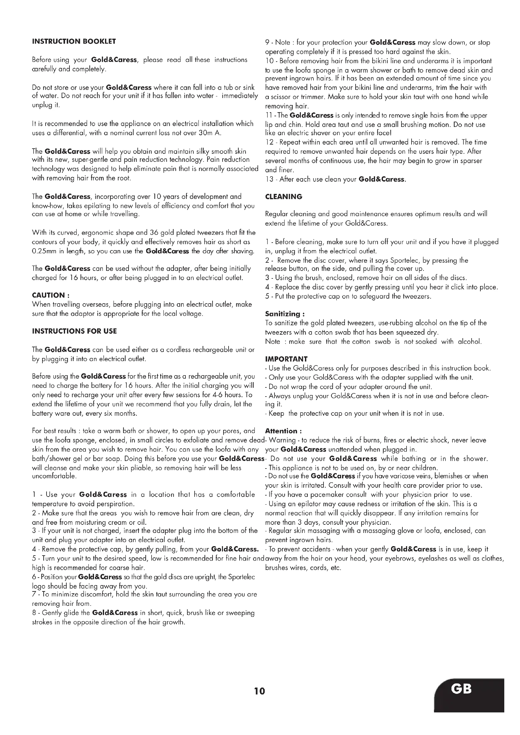 NSTRUCTION BOOKLET Before using your Gold&Caress, please read all these instructions
