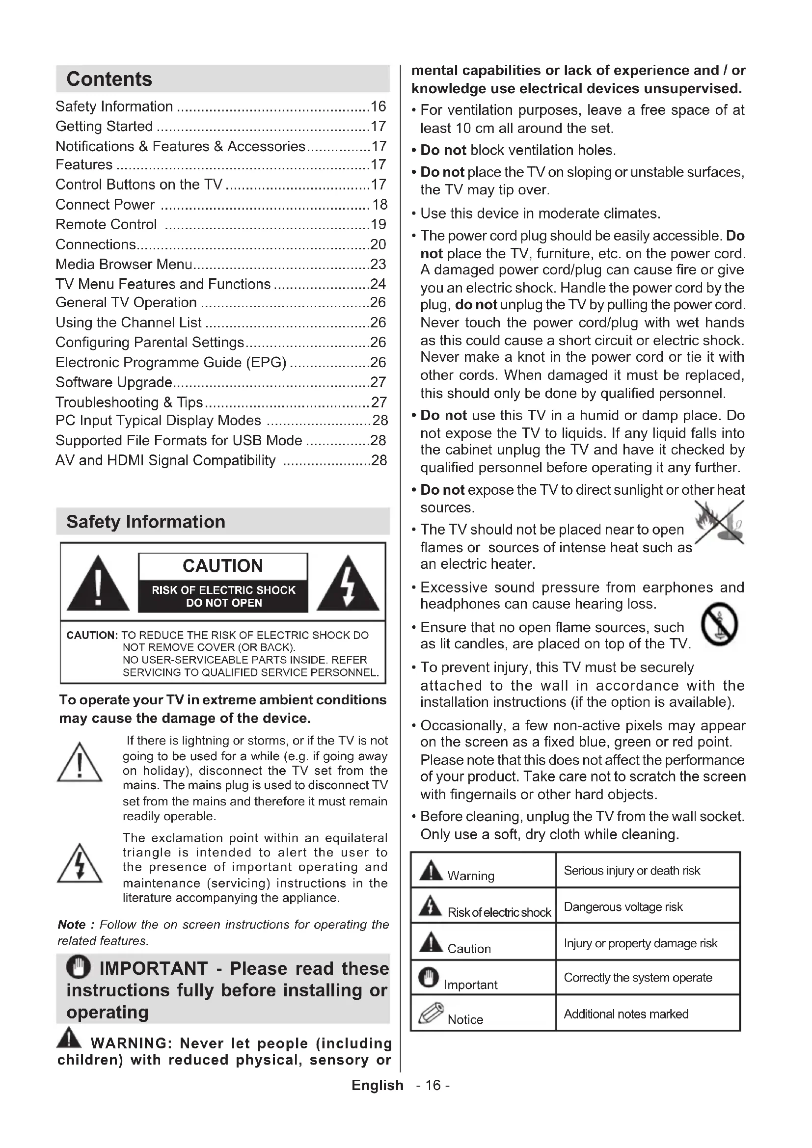 - Before cleaning, unplug the TV from the wall socket. Only use a soft, dry cloth while cleaning. WarningSerious injury or death risk Risk of electric shockDangerous voltage risk CautionInjury or property damage risk ImportantCorrectly the system operate NoticeAdditional notes marked Safety Information ................................................16 Getting Started .....................................................17 Notications&Features&Accessories ................17 Features ...............................................................17 Control Buttons on the TV ....................................17 Connect Power .................................................... 18 Remote Control ...................................................19 Connections..........................................................20 Media Browser Menu............................................23 TV Menu Features and Functions ........................24 General TV Operation ..........................................26 Using the Channel List .........................................26 ConguringParentalSettings ...............................26 Electronic Programme Guide (EPG) ....................26 Software Upgrade.................................................27 Troubleshooting&Tips ......................................... 27 PC Input Typical Display Modes .......................... 28 Supported File Formats for USB Mode ................28 AV and HDMI Signal Compatibility ......................28Getting Started English - 17 - Notications&Features&Accessories Environmental Information This television is designed to consume less energy to help save the environment. To reduce energy consumption, you should take the following steps: If you set the Power Save Mode as Eco, the TV will switch to energy-saving mode. The Power Save Mode settings can be found In the ‘Picture’ section of the Main Menu. Note that some picture settings will be unavailable to be changed. If Picture Off is selected, “Screen will be off in 3 seconds.” message will be displayed. Select PROCEED and press OK to continue. The screen will be off immediately. When the TV is not in use, please switch off or disconnect the TV from the mains plug. This will also reduce energy consumption. StandbyNotications