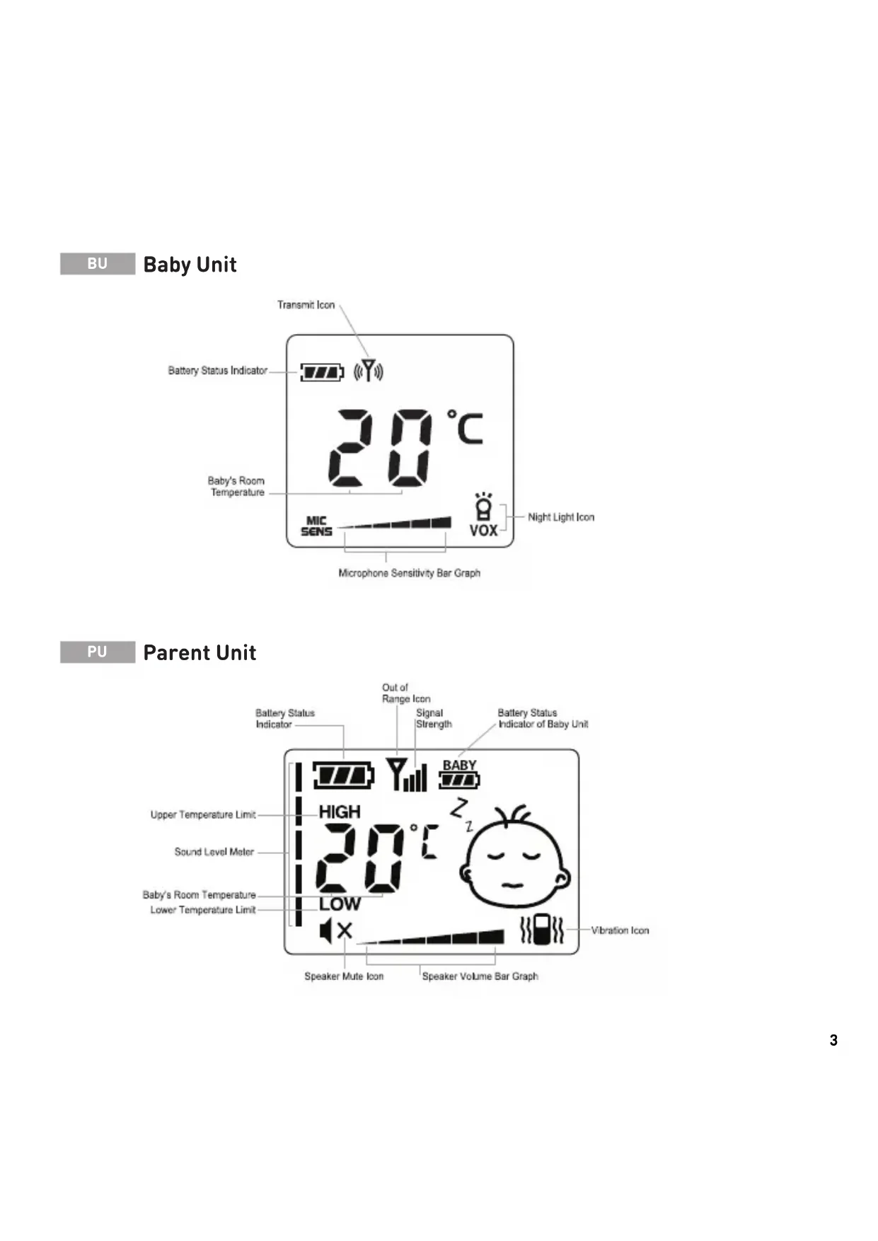 Adjusting the speaker volume on parent unit Parent unit must be turned on. Parent unit: Use the (+)/(-) buttons to adjust the volume. The volume bar graph at the bottom of the display will be adjusted at the same time to show the current speaker volume. When volume is turned all the way down (volume = OFF) display is showing Adjusting the microphone sensitivity of the baby unit The baby unit must be turned on. Baby unit: Use the (+)/(-) buttons to adjust the sensitivity of the microphone. The MIC SENS bar graph at the bottom of the display will be adjusted at the same time to show the current microphone sensitivity. When sensitivity is turned up, lower sounds are detected easier. When the sensitivity is turned down, the sound has to be louder for the microphone and thereby the baby unit to be activated.