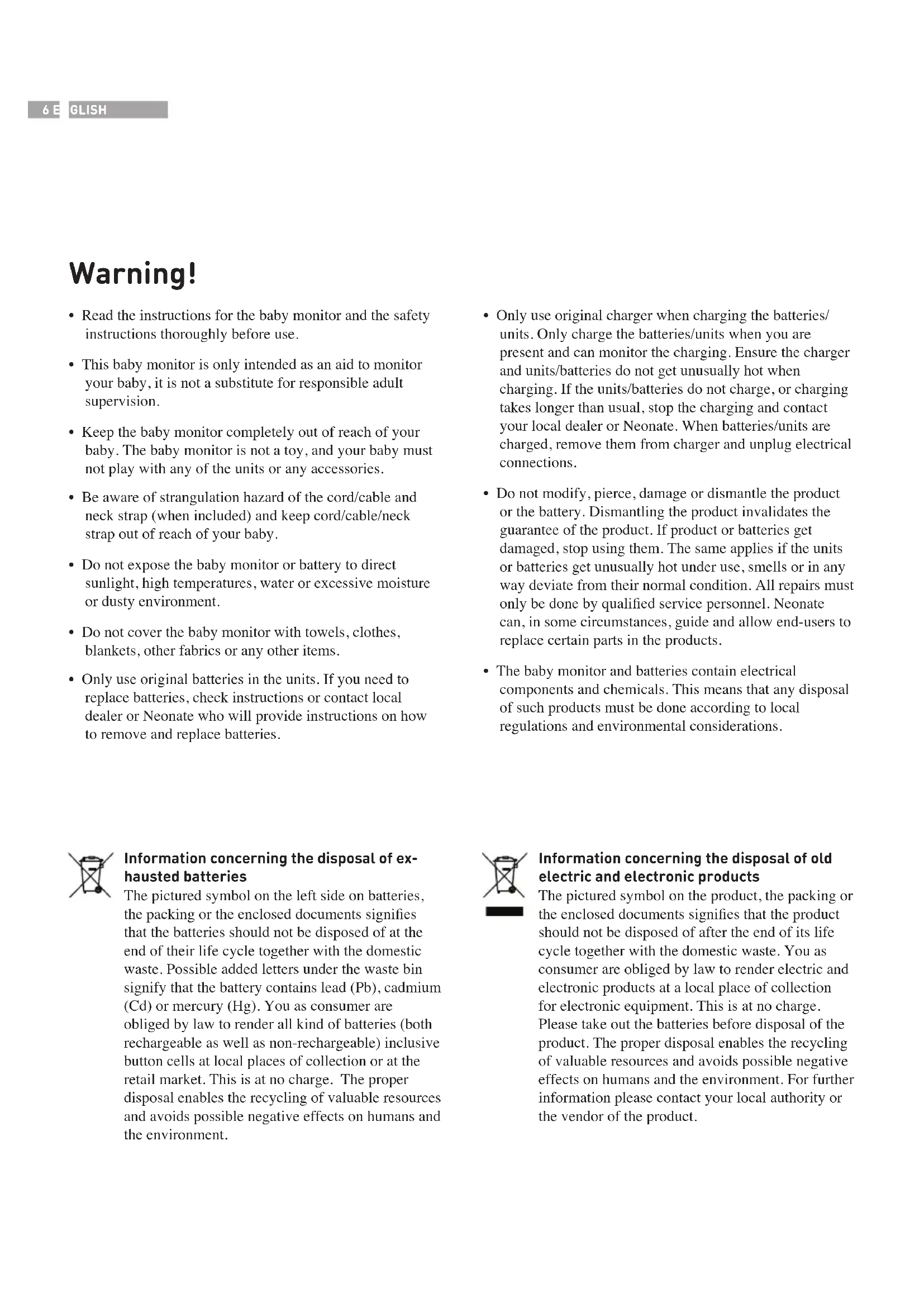 - The baby monitor and batteries contain electrical components and chemicals. This means that any disposal of such products must be done according to local regulations and environmental considerations.7 Batteries requires caution! When charging a battery there is always a small risk that a short-circuit or a malfunction can cause the battery to over- heat and catch re. It is highly recommended that you never charge a battery in an unsupervised environment. Warning!