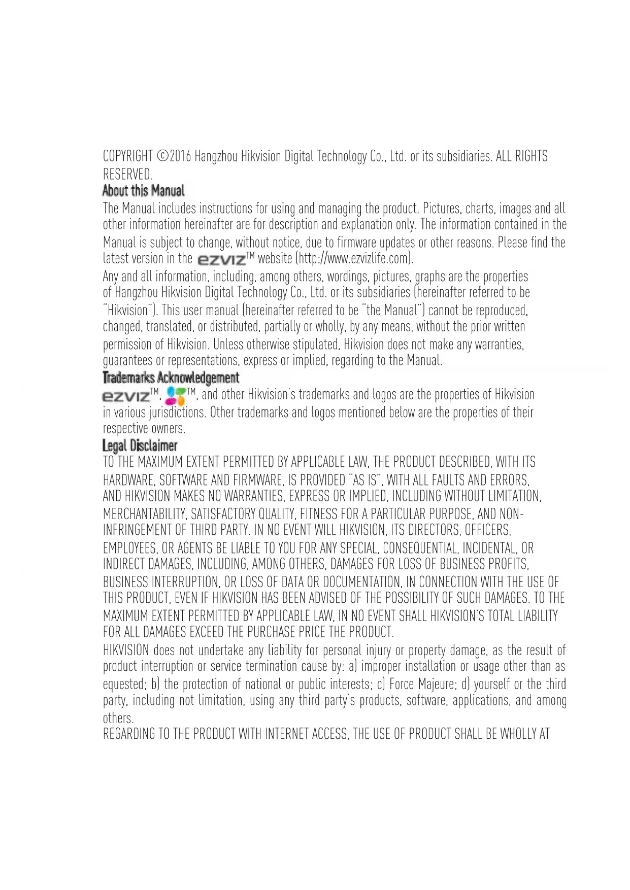 ACTION CAMERA Quick Start Guide UD01490B-CCOPYRIGHT ©2016 Hangzhou Hikvision Digital Technology Co., Ltd. or its subsidiaries. ALL RIGHTS RESERVED. About this Manual The Manual includes instructions for using and managing the product. Pictures, charts, images and all other information hereinafter are for description and explanation only. The information contained in the Manual is subject to change, without notice, due to firmware updates or other reasons. Please find the latest version in the ™ website (http://www.ezvizlife.com). Any and all information, including, among others, wordings, pictures, graphs are the properties of Hangzhou Hikvision Digital Technology Co., Ltd. or its subsidiaries (hereinafter referred to be “Hikvision”). This user manual (hereinafter referred to be “the Manual”) cannot be reproduced, changed, translated, or distributed, partially or wholly, by any means, without the prior written permission of Hikvision. Unless otherwise stipulated, Hikvision does not make any warranties, guarantees or representations, express or implied, regarding to the Manual. Trademarks Acknowledgement ™, ™, and other Hikvision’s trademarks and logos are the properties of Hikvision in various jurisdictions. Other trademarks and logos mentioned below are the properties of their respective owners. Legal Disclaimer TO THE MAXIMUM EXTENT PERMITTED BY APPLICABLE LAW, THE PRODUCT DESCRIBED, WITH ITS HARDWARE, SOFTWARE AND FIRMWARE, IS PROVIDED “AS IS”, WITH ALL FAULTS AND ERRORS, AND HIKVISION MAKES NO WARRANTIES, EXPRESS OR IMPLIED, INCLUDING WITHOUT LIMITATION, MERCHANTABILITY, SATISFACTORY QUALITY, FITNESS FOR A PARTICULAR PURPOSE, AND NON- INFRINGEMENT OF THIRD PARTY. IN NO EVENT WILL HIKVISION, ITS DIRECTORS, OFFICERS, EMPLOYEES, OR AGENTS BE LIABLE TO YOU FOR ANY SPECIAL, CONSEQUENTIAL, INCIDENTAL, OR INDIRECT DAMAGES, INCLUDING, AMONG OTHERS, DAMAGES FOR LOSS OF BUSINESS PROFITS, BUSINESS INTERRUPTION, OR LOSS OF DATA OR DOCUMENTATION, IN CONNECTION WITH THE USE OF THIS PRODUCT, EVEN IF HIKVISION HAS BEEN ADVISED OF THE POSSIBILITY OF SUCH DAMAGES. TO THE MAXIMUM EXTENT PERMITTED BY APPLICABLE LAW, IN NO EVENT SHALL HIKVISION’S TOTAL LIABILITY FOR ALL DAMAGES EXCEED THE PURCHASE PRICE THE PRODUCT. HIKVISION does not undertake any liability for personal injury or property damage, as the result of product interruption or service termination cause by: a) improper installation or usage other than as equested; b) the protection of national or public interests; c) Force Majeure; d) yourself or the third party, including not limitation, using any third party’s products, software, applications, and among others. REGARDING TO THE PRODUCT WITH INTERNET ACCESS, THE USE OF PRODUCT SHALL BE WHOLLY ATYOUR OWN RISKS. HIKVISION SHALL NOT TAKE ANY RESPONSIBILITES FOR ABNORMAL OPERATION, PRIVACY LEAKAGE OR OTHER DAMAGES RESULTING FROM CYBER ATTACK, HACKER ATTACK, VIRUS INSPECTION, OR OTHER INTERNET SECURITY RISKS; HOWEVER, HIKVISION WILL PROVIDE TIMELY TECHNICAL SUPPORT IF REQUIRED. SURVEILLANCE LAWS VARY BY JURISDICTION. PLEASE CHECK ALL RELEVANT LAWS IN YOUR JURISDICTION BEFORE USING THIS PRODUCT IN ORDER TO ENSURE THAT YOUR USE CONFORMS TO THE APPLICABLE LAW. YOU FUTHER AGREE THAT THIS PRODUCT IS ONLY FOR CIVIL USE, AND HIKVISION SHALL NOT BE LIABLE IN THE EVENT THAT THIS PRODUCT IS USED WITH ILLEGITIMATE PURPOSES, SUCH AS THIRD PARTY RIGHTS INFRINGEMENT, MEDICAL TREATMENT, SAFETY EQUIPMENT OR OTHER SITUATIONS WHERE THE PRODUCT FAILURE COULD LEAD TO DEATH OR PERSONAL INJURY, OR WEAPON OF MASS DESTRUCTION, CHEMINCAL AND BIOLOGICAL WEAPON, NUCLEAR EXPLOSION, AND ANY UNSAFE NUCLEAR ENERGY USES OR ANTI-HUMANITY USAGES. YOU SHOULD UNDERTAKE ALL RESPONSIBILITIES FOR LOSSES OR DAMAGES RESULTING FROM THE ABOVE USAGES WHATSOEVER. IN THE EVENT OF ANY CONFLICTS BETWEEN THE ABOVE AND THE APPLICABLE LAW, THE LATER PREVAILS. Regulatory Information This device complies with Part 15 of the FCC Rules. Operation is subject to the following two conditions: (1) This device may not cause harmful interference, and (2) This device must accept any interference received, including interference that may cause undesired operation. Please take attention that changes or modification not expressly approved by the party responsible for compliance could void the user’s authority to operate the equipment. Note: This product has been tested and found to comply with the limits for a Class B digital device, pursuant to Part 15 of the FCC Rules. These limits are designed to provide reasonable protection against harmful interference in a residential installation. This product generates, uses, and can radiate radio frequency energy and, if not installed and used in accordance with the instructions, may cause harmful interference to radio communications. However, there is no guarantee that interference will not occur in a particular installation. If this product does cause harmful interference to radio or television reception, which can be determined by turning the equipment off and on, the user is encouraged to try to correct the interference by one or more of the following measures: —Reorient or relocate the receiving antenna. —Increase the separation between the equipment and receiver.—Connect the equipment into an outlet on a circuit different from that to which the receiver is connected. —Consult the dealer or an experienced radio/TV technician for help. EU Conformity Statement This product and - if applicable - the supplied accessories too are marked with "CE" and comply therefore with the applicable harmonized European standards listed under the Radio Equipment Directive 2014/53/EU, the EMC Directive 2014/30/EU, the RoHS Directive 2011/65/EU. 2012/19/EU (WEEE directive): Products marked with this symbol cannot be disposed of as unsorted municipal waste in the European Union. For proper recycling, return this product to your local supplier upon the purchase of equivalent new equipment, or dispose of