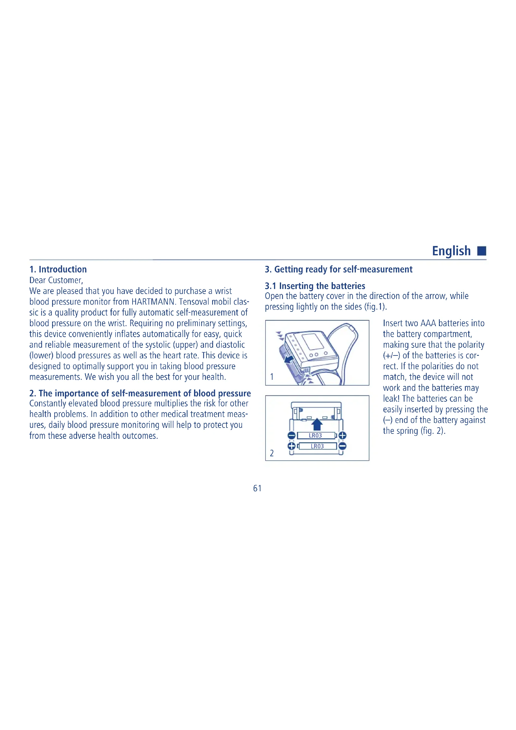 *GA Tensoval mobil classic 02.03.10 14:11 Seite 601. Introduction Dear Customer, We are pleased that you have decided to purchase a wrist blood pressure monitor from HARTMANN. Tensoval mobil clas- sic is a quality product for fully automatic self-measurement of blood pressure on the wrist. Requiring no preliminary settings, this device conveniently inflates automatically for easy, quick and reliable measurement of the systolic (upper) and diastolic (lower) blood pressures as well as the heart rate. This device is designed to optimally support you in taking blood pressure measurements. We wish you all the best for your health.