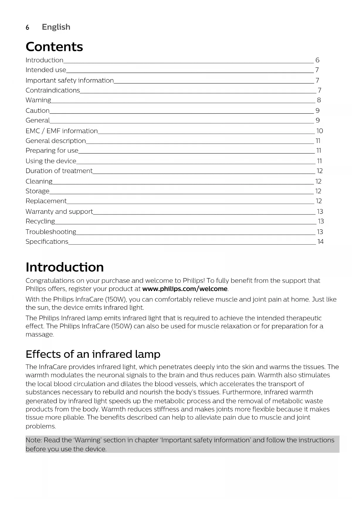 89English Contents Introduction__________________________________________________________________________________________ 6 Intended use_________________________________________________________________________________________ 7 Important safety information________________________________________________________________________ 7 Contraindications_____________________________________________________________________________________ 7 Warning_______________________________________________________________________________________________ 8 Caution_______________________________________________________________________________________________ 9 General_______________________________________________________________________________________________ 9 EMC / EMF information______________________________________________________________________________ 10 General description__________________________________________________________________________________ 11 Preparing for use_____________________________________________________________________________________ 11 Using the device______________________________________________________________________________________ 11 Duration of treatment________________________________________________________________________________ 12 Cleaning______________________________________________________________________________________________ 12 Storage_______________________________________________________________________________________________ 12 Replacement_________________________________________________________________________________________ 12 Warranty and support________________________________________________________________________________ 13 Recycling______________________________________________________________________________________________ 13 Troubleshooting______________________________________________________________________________________ 13 Specifications_________________________________________________________________________________________ 14 Introduction Congratulations on your purchase and welcome to Philips! To fully benefit from the support that Philips offers, register your product at www.philips.com/welcome. With the Philips InfraCare (150W), you can comfortably relieve muscle and joint pain at home. Just like the sun, the device emits infrared light. The Philips Infrared lamp emits infrared light that is required to achieve the intended therapeutic effect. The Philips InfraCare (150W) can also be used for muscle relaxation or for preparation for a massage. Effects of an infrared lamp The InfraCare provides infrared light, which penetrates deeply into the skin and warms the tissues. The warmth modulates the neuronal signals to the brain and thus reduces pain. Warmth also stimulates the local blood circulation and dilates the blood vessels, which accelerates the transport of substances necessary to rebuild and nourish the body’s tissues. Furthermore, infrared warmth generated by infrared light speeds up the metabolic process and the removal of metabolic waste products from the body. Warmth reduces stiffness and makes joints more flexible because it makes tissue more pliable. The benefits described can help to alleviate pain due to muscle and joint problems. Note: Read the ‘Warning’ section in chapter ‘Important safety information’ and follow the instructions before you use the device.