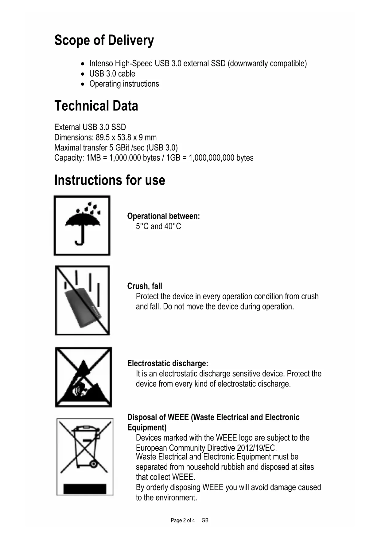 Disposal of WEEE (Waste Electrical and Electronic Equipment) Devices marked with the WEEE logo are subject to the European Community Directive 2012/19/EC. Waste Electrical and Electronic Equipment must be separated from household rubbish and disposed at sites that collect WEEE. By orderly disposing WEEE you will avoid damage caused to the environment.Page 3 of 4 GB Installation Instructions System Requirements: This external SSD is compatible with the operating systems MS Windows 7 / 8 / 8.1 / 10 and Mac OS 10.x. Please note: For the USB 3.0 operation an USB 3.0 interface card is needed. The external SSD is downward compatible with the anterior USB standards. The hardware configuration of your PC and the used operational system can influence the compatibility of the external SSD.