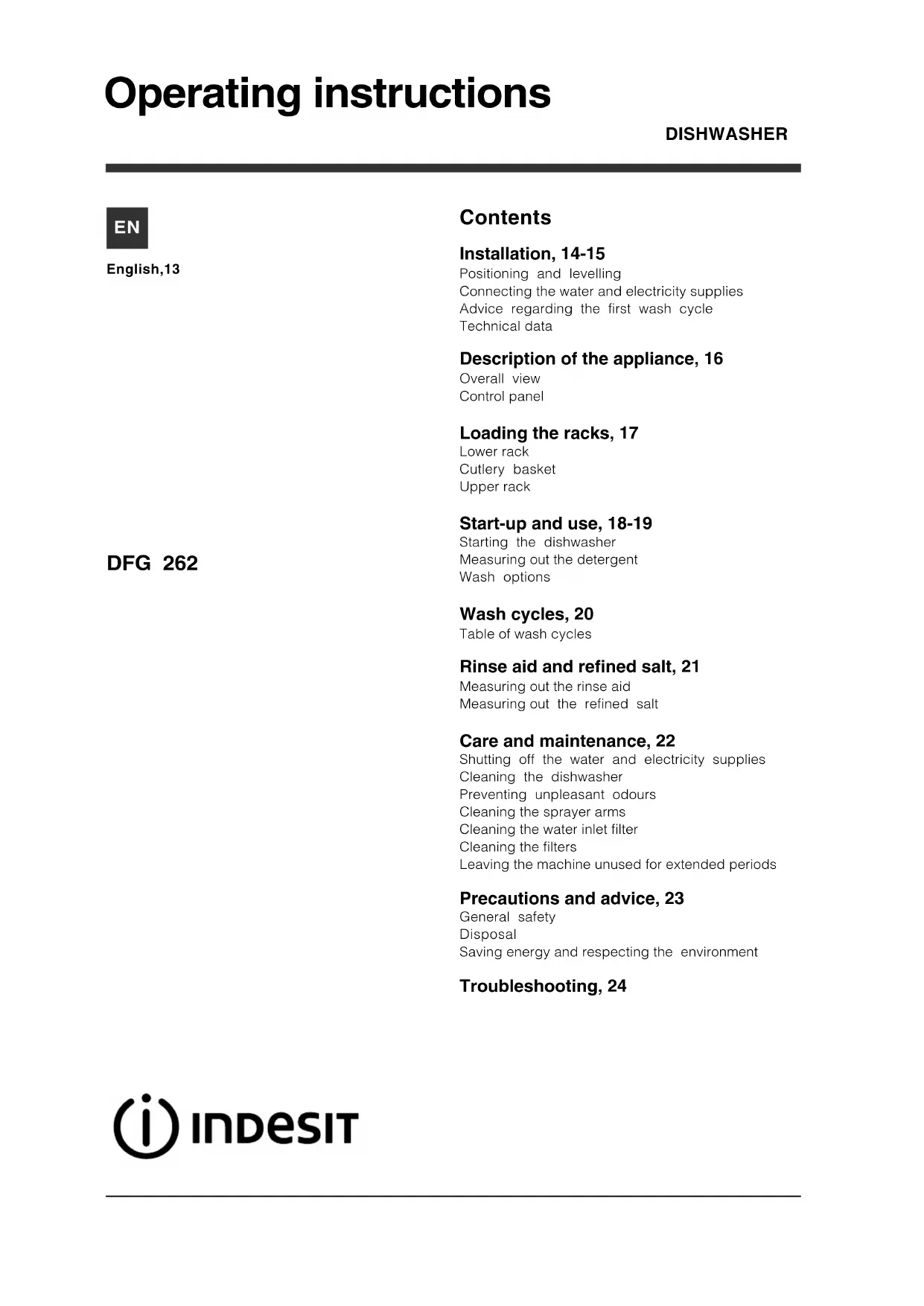 - Spegnere la macchina premendo il tasto ON/OFF. Chiudere il rubinetto dell’acqua per evitare allagamenti, staccare la spina della corrente. Controllare che il filtro entrata acqua non sia intasato da impurità . (vedere capitolo "Manutenzione e Cura")Operating instructions Contents Installation, 14-15 Positioning and levelling Connecting the water and electricity supplies Advice regarding the first wash cycle Technical data Description of the appliance, 16 Overall view Control panel Loading the racks, 17 Lower rack Cutlery basket Upper rack Start-up and use, 18-19 Starting the dishwasher Measuring out the detergent Wash options Wash cycles, 20 Table of wash cycles Rinse aid and refined salt, 21 Measuring out the rinse aid Measuring out the refined salt Care and maintenance, 22 Shutting off the water and electricity supplies Cleaning the dishwasher Preventing unpleasant odours Cleaning the sprayer arms Cleaning the water inlet filter Cleaning the filters Leaving the machine unused for extended periods Precautions and advice, 23 General safety Disposal Saving energy and respecting the environment Troubleshooting, 24 DFG 262 DISHWASHER English,13 ENEN