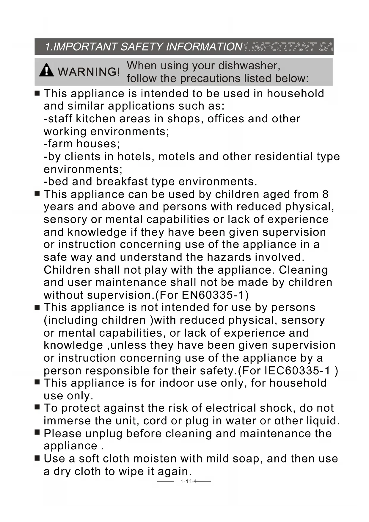 - The Method Loading Normal Dishware Loading the baskets according to En50242 Loading the baskets according to En50242 To review the section on troubleshooting Tips will help you to solve some common problems by yourself . NOTE: Dear Customer, Please carefully read this manual before using the dishwasher, it will help you to use and maintain the dishwasher properly. Pass it on to any subsequent owner of the appliance. This manual contains sections on safety Instructions, Operating Instructions, Installation Instructions and Troubleshooting Tips, etc. The manufacturer, following a policy of constant development and updating of the product, may make modifications without giving prior notice. This user manual shall also be got from the manufacturer or responsible vendor. Read this Manual Before Calling for Service Keep it to refer to it at a later date. If you can not solve the problems by yourself , please ask for the help of professional technicians.1-11-1 This appliance is intended to be used in household and similar applications such as: -staff kitchen areas in shops, offices and other working environments; -farm houses; -by clients in hotels, motels and other residential type environments; -bed and breakfast type environments. This appliance can be used by children aged from 8 years and above and persons with reduced physical, sensory or mental capabilities or lack of experience and knowledge if they have been given supervision or instruction concerning use of the appliance in a safe way and understand the hazards involved. Children shall not play with the appliance. Cleaning and user maintenance shall not be made by children without supervision.(For EN60335-1) This appliance is not intended for use by persons (including children )with reduced physical, sensory or mental capabilities, or lack of experience and knowledge ,unless they have been given supervision or instruction concerning use of the appliance by a person responsible for their safety.(For IEC60335-1 ) This appliance is for indoor use only, for household use only. To protect against the risk of electrical shock, do not immerse the unit, cord or plug in water or other liquid. Please unplug before cleaning and maintenance the appliance . Use a soft cloth moisten with mild soap, and then use a dry cloth to wipe it again. p. 10