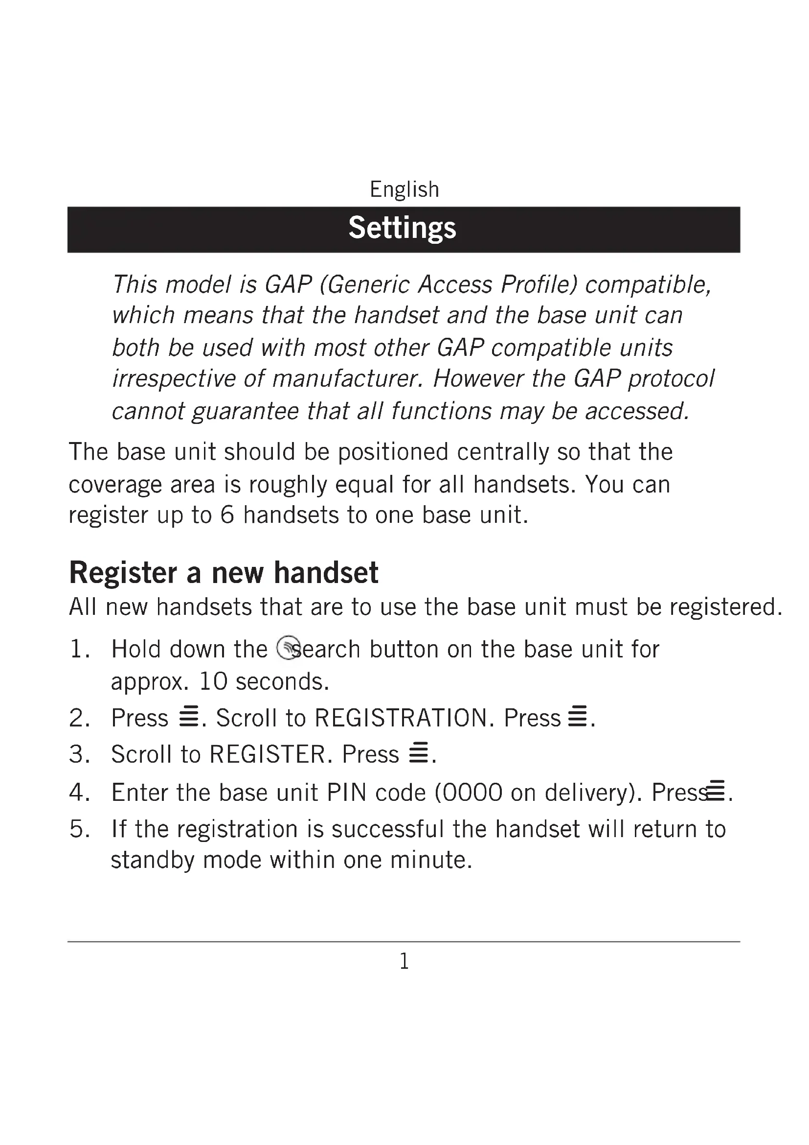 PhoneEasy 336w AHS1 English Settings This model is GAP (Generic Access Prole) compatible, which means that the handset and the base unit can both be used with most other GAP compatible units irrespective of manufacturer. However the GAP protocol cannot guarantee that all functions may be accessed. The base unit should be positioned centrally so that the coverage area is roughly equal for all handsets. You can register up to 6 handsets to one base unit. Register a new handset All new handsets that are to use the base unit must be registered. Hold down the search button on the base unit for approx. 10 seconds. Press