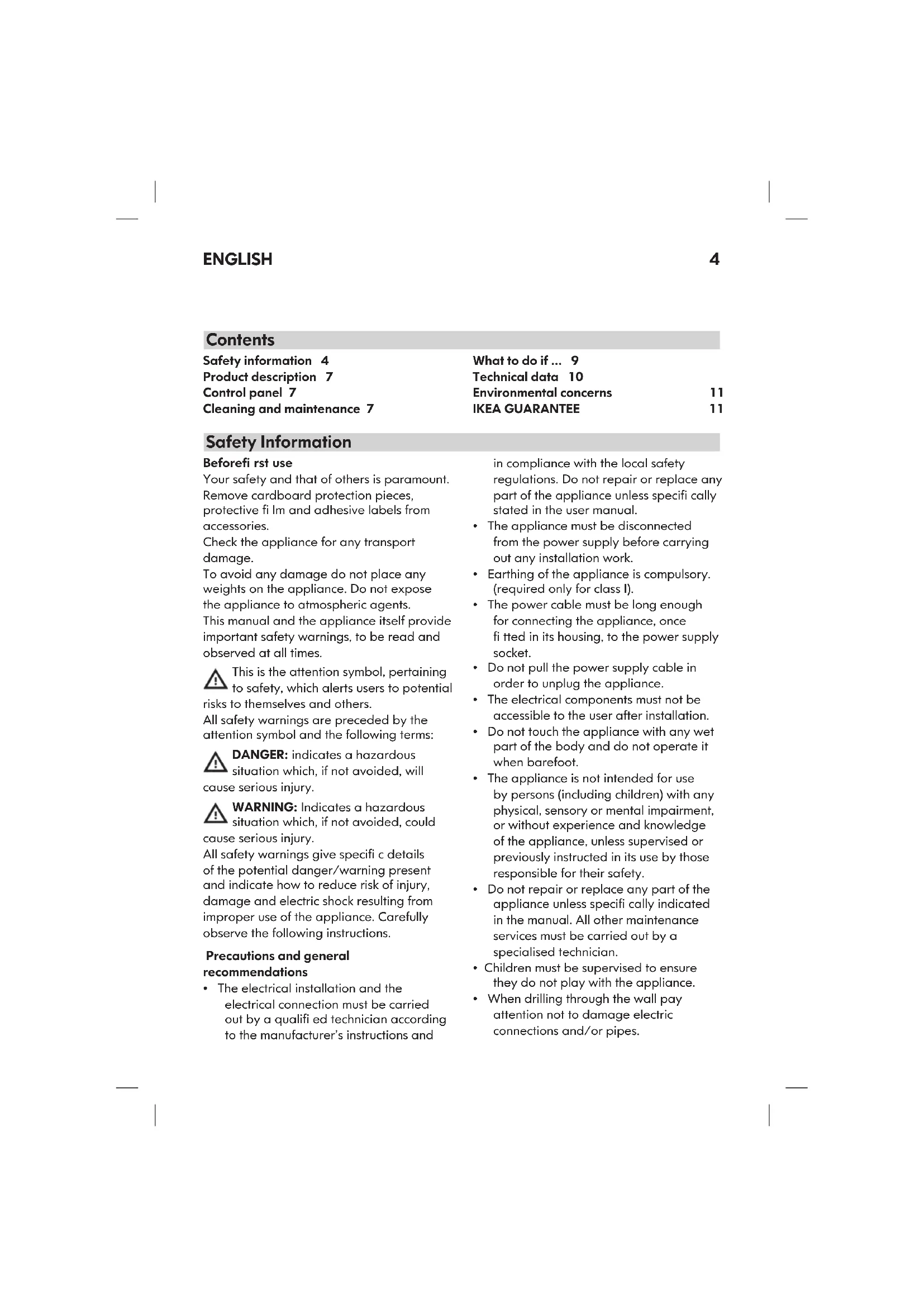 - When drilling through the wall pay attention not to damage electric connections and/or pipes. Safety information 4 Product description 7 Control panel 7 Cleaning and maintenance 7 What to do if ... 9 Technical data 10 Environmental concerns 11 IKEA GUARANTEE 11 Safety Information ContentsENGLISH 5
