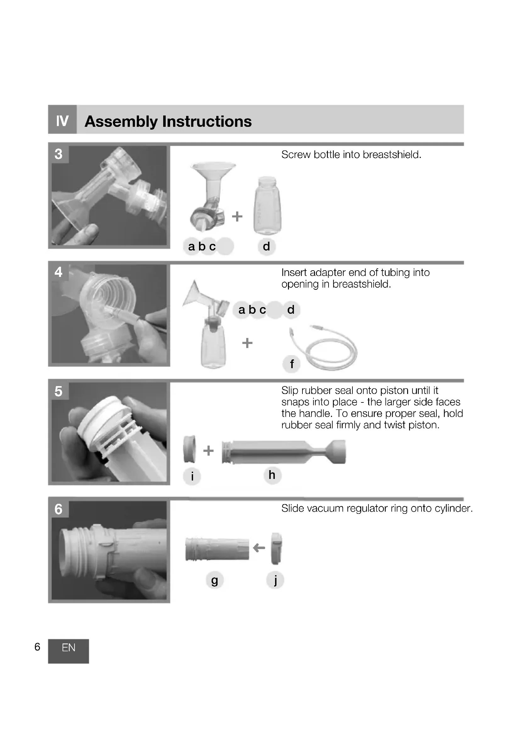 Breastshield:Availableinfivesizes-becauseonesizedoesnotfitall. Breastshield Fitting VII Lactina Select only The Lactina Select features an additional knob to adjust the pumping speed. Choose a fast pumping rhythm to start your milk flowing (setting 7 corresponds to highest speed level). Once your milk starts to flow or you sense milk ejection you may adjust the rhythm by decreasing speed slightly (e.g. setting 4). Pumping VI11EN Manual Pumping VIlI Screw cylinder into breastshield. Set the vacuum regulator to minimum and start pumping. Adjust the vacuum to your Maximum Comfort Vacuum™. This is the highest vacuum you can use and still feel comfortable (different for every mother). To find your Maximum Comfort Vacuum increase vacuum until pumping feels slightly uncomfortable (not painful), then decrease slightly. Cleaning and Hygiene