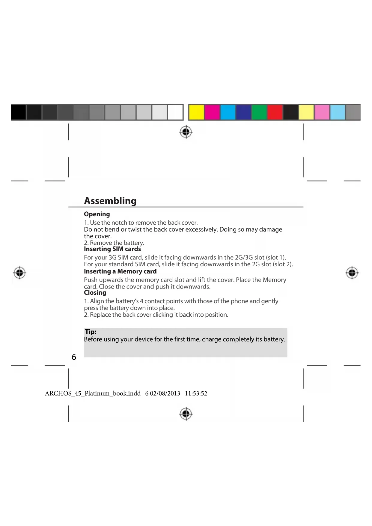 Tip: Before using your device for the first time, charge completely its battery. ARCHOS_45_Platinum_book.indd 6 02/08/2013 11:53:527 Picture to show how to removed the bottom casing Picture to show how to insert the battery pack Picture to show the scards position Picture to show how to removed the bottom casing Picture to show how to insert the battery pack Picture to show the scards position Slot 1Slot 2Slot 3