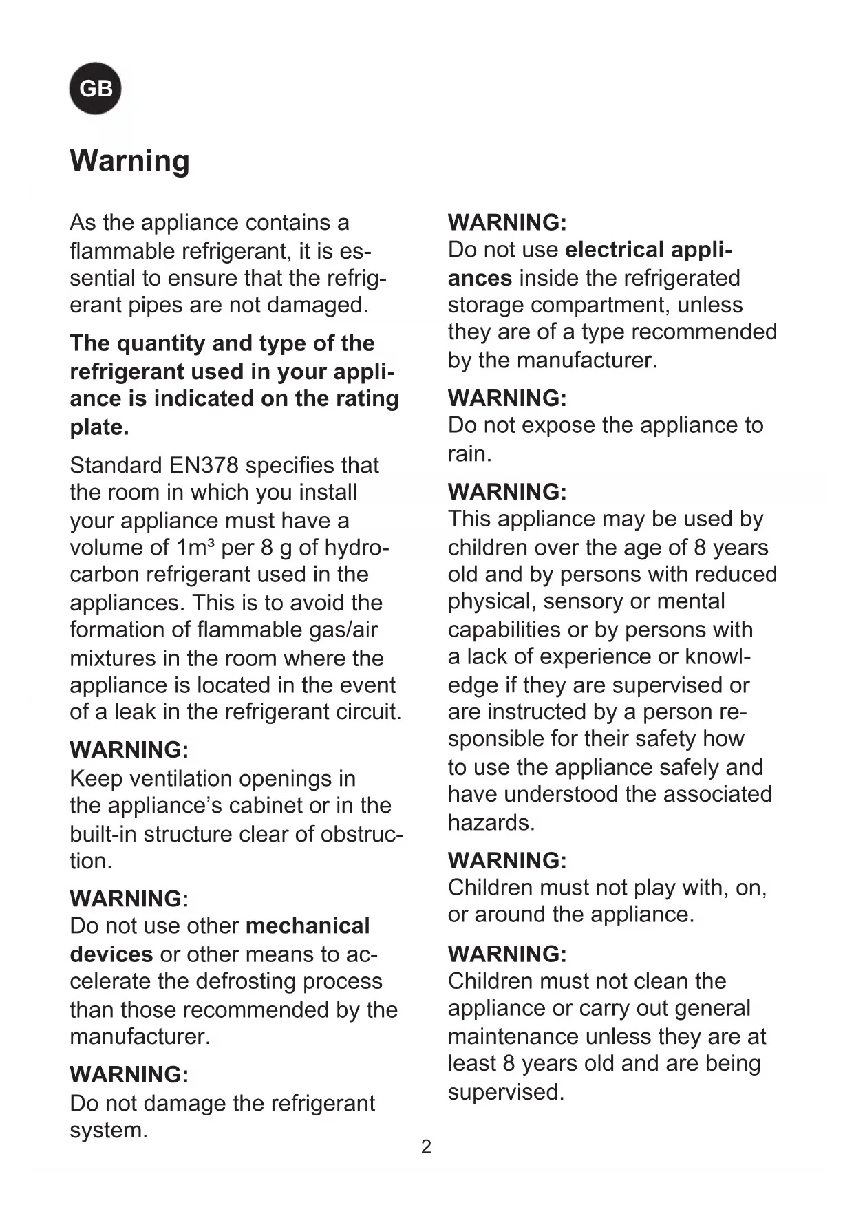 As the appliance contains a ammable refrigerant, it is es- sential to ensure that the refrig- erant pipes are not damaged. The quantity and type of the refrigerant used in your appli- ance is indicated on the rating plate. Standard EN378 species that the room in which you install your appliance must have a volume of 1m³ per 8 g of hydro- carbon refrigerant used in the appliances. This is to avoid the formation of ammable gas/air mixtures in the room where the appliance is located in the event of a leak in the refrigerant circuit.