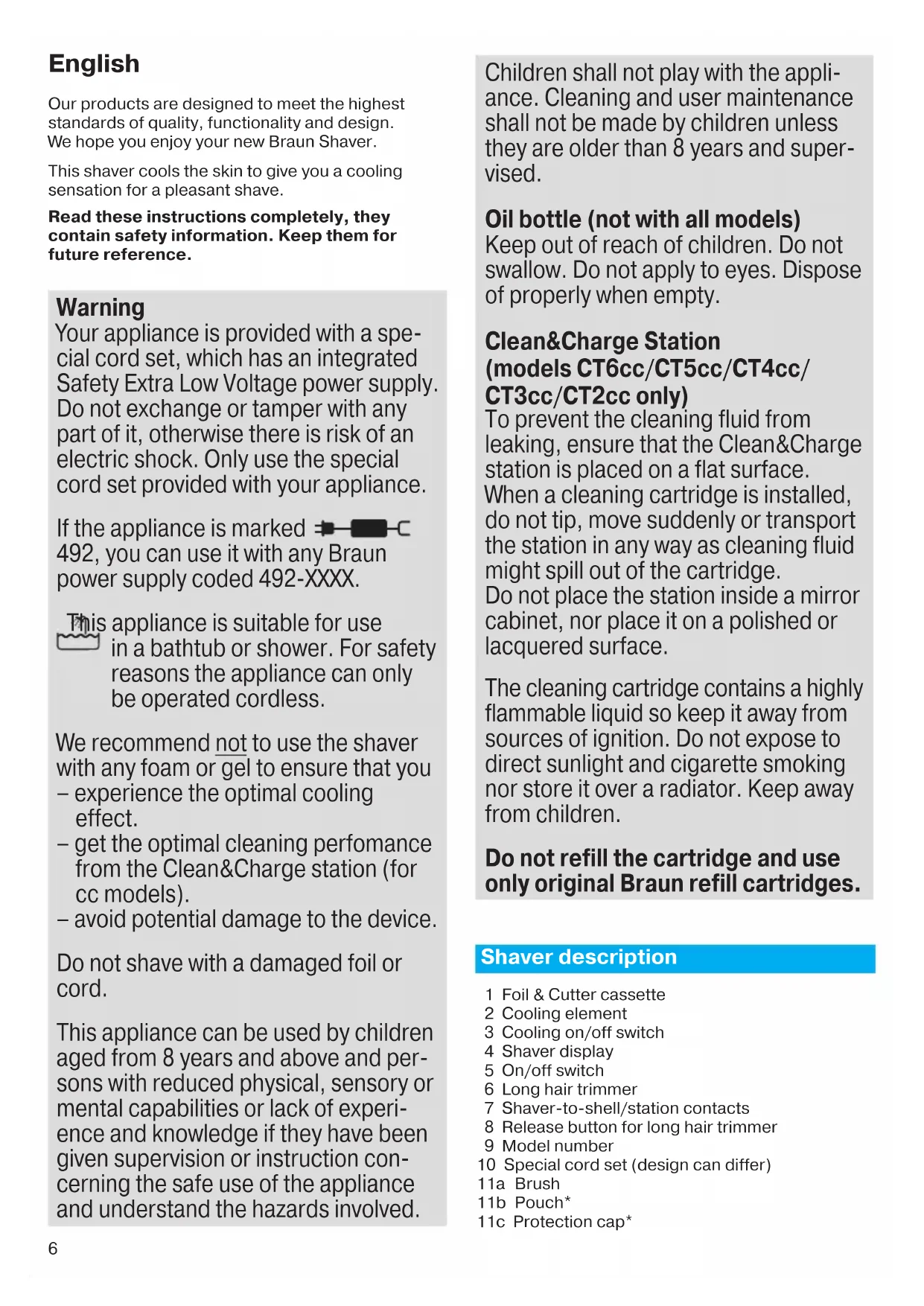 91004880_CoolTec_CEEMEA_S5.indd 1 07.07.16 14:14 CSS APPROVED Effective Date 22Jul2016 GMT - Printed 27Sep2016 Page 5 of 886 English Our products are designed to meet the highest standards of quality, functionality and design. We hope you enjoy your new Braun Shaver. This shaver cools the skin to give you a cooling sensation for a pleasant shave. Read these instructions completely, they contain safety information. Keep them for future reference. Warning Your appliance is provided with a spe- cial cord set, which has an integrated Safety Extra Low Voltage power supply. Do not exchange or tamper with any part of it, otherwise there is risk of an electric shock. Only use the special cord set provided with your appliance. If the appliance is marked 492, you can use it with any Braun power supply coded 492-XXXX. This appliance is suitable for use in a bathtub or shower. For safety reasons the appliance can only be operated cordless. We recommend not to use the shaver with any foam or gel to ensure that you – experience the optimal cooling effect. – get the optimal cleaning perfomance from the Clean&Charge station (for cc models). – avoid potential damage to the device. Do not shave with a damaged foil or cord. This appliance can be used by children aged from 8 years and above and per- sons with reduced physical, sensory or mental capabilities or lack of experi- ence and knowledge if they have been given supervision or instruction con- cerning the safe use of the appliance and understand the hazards involved. Children shall not play with the appli- ance. Cleaning and user maintenance shall not be made by children unless they are older than 8 years and super- vised. Oil bottle (not with all models) Keep out of reach of children. Do not swallow. Do not apply to eyes. Dispose of properly when empty. Clean&Charge Station (models CT6cc/CT5cc/CT4cc/ CT3cc/CT2cc only) To prevent the cleaning fluid from leaking, ensure that the Clean&Charge station is placed on a flat surface. When a cleaning cartridge is installed, do not tip, move suddenly or transport the station in any way as cleaning fluid might spill out of the cartridge. Do not place the station inside a mirror cabinet, nor place it on a polished or lacquered surface. The cleaning cartridge contains a highly flammable liquid so keep it away from sources of ignition. Do not expose to direct sunlight and cigarette smoking nor store it over a radiator. Keep away from children. Do not refill the cartridge and use only original Braun refill cartridges. Shaver description 1 Foil & Cutter cassette 2 Cooling element 3 Cooling on/off switch 4 Shaver display 5 On/off switch 6 Long hair trimmer 7 Shaver-to-shell/station contacts 8 Release button for long hair trimmer 9 Model number 10 Special cord set (design can differ) 11a Brush 11b Pouch* 11c Protection cap* 91004880_CoolTec_CEEMEA_S6-88.indd 6 21.07.16 12:25 CSS APPROVED Effective Date 22Jul2016 GMT - Printed 27Sep2016 Page 6 of 887 12a Charging shell 12b Shell power socket 12c Stand for charging shell* 12d Shell-to-shaver contacts *not with all models First use and Charging Prior to first use connect the shaver to an electrical outlet using the charging shell as described below or for models CT6cc/CT5cc/CT4cc/CT3cc/ CT2cc the Clean&Charge station (see Chapter «Clean&Charge station»). Note: The shaver can only be charged via the charging shell or the Clean&Charge station. Models CT4s/CT2s must not be used with the Clean&Charge station. Charging shell (see fig. B)
