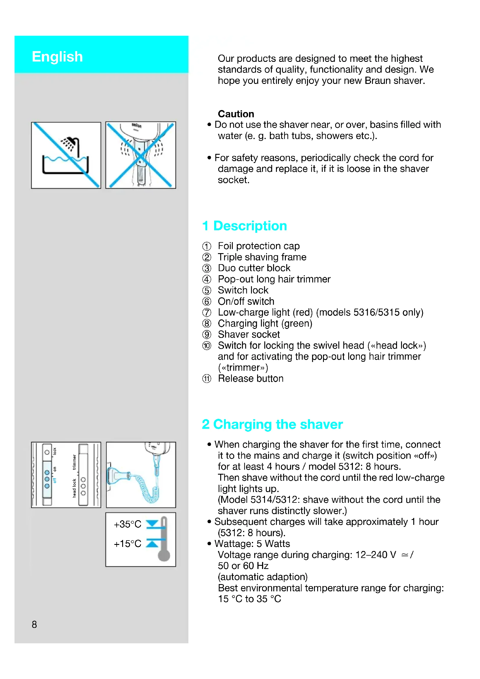 - Model 5316/5315 only: The red low-charge light lights up when the capacity has dropped below 20 %, provided the shaver is switched on. The remaining capacity will then be sufficient for 2 to 3 shaves. 4 Shaving