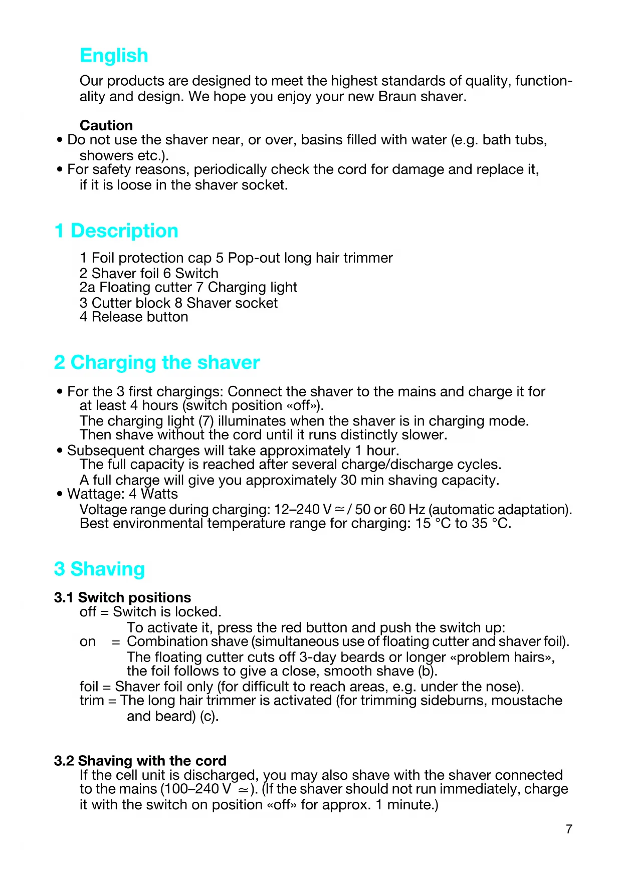 - For the 3 first chargings: Connect the shaver to the mains and charge it for at least 4 hours (switch position «off»). The charging light (7) illuminates when the shaver is in charging mode. Then shave without the cord until it runs distinctly slower.