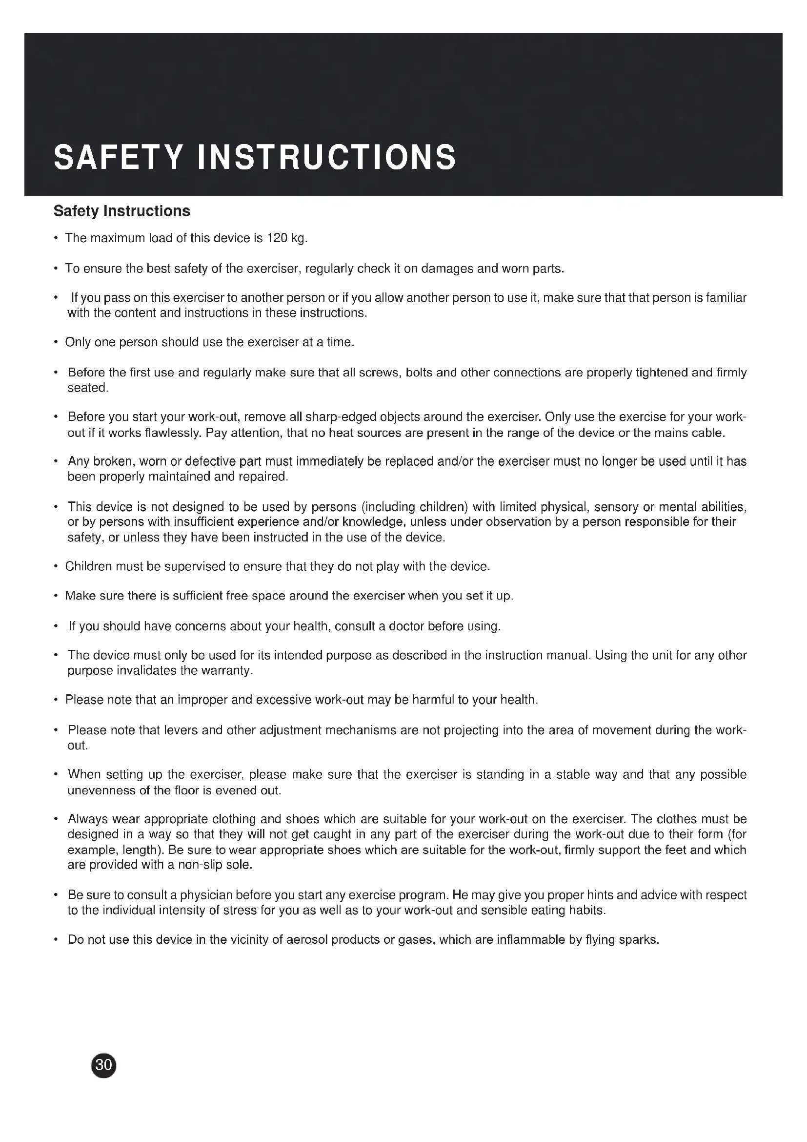 - Children, disabled and handicapped persons should use the exercise only under supervision and in presence of another person who may give support and useful instructions.