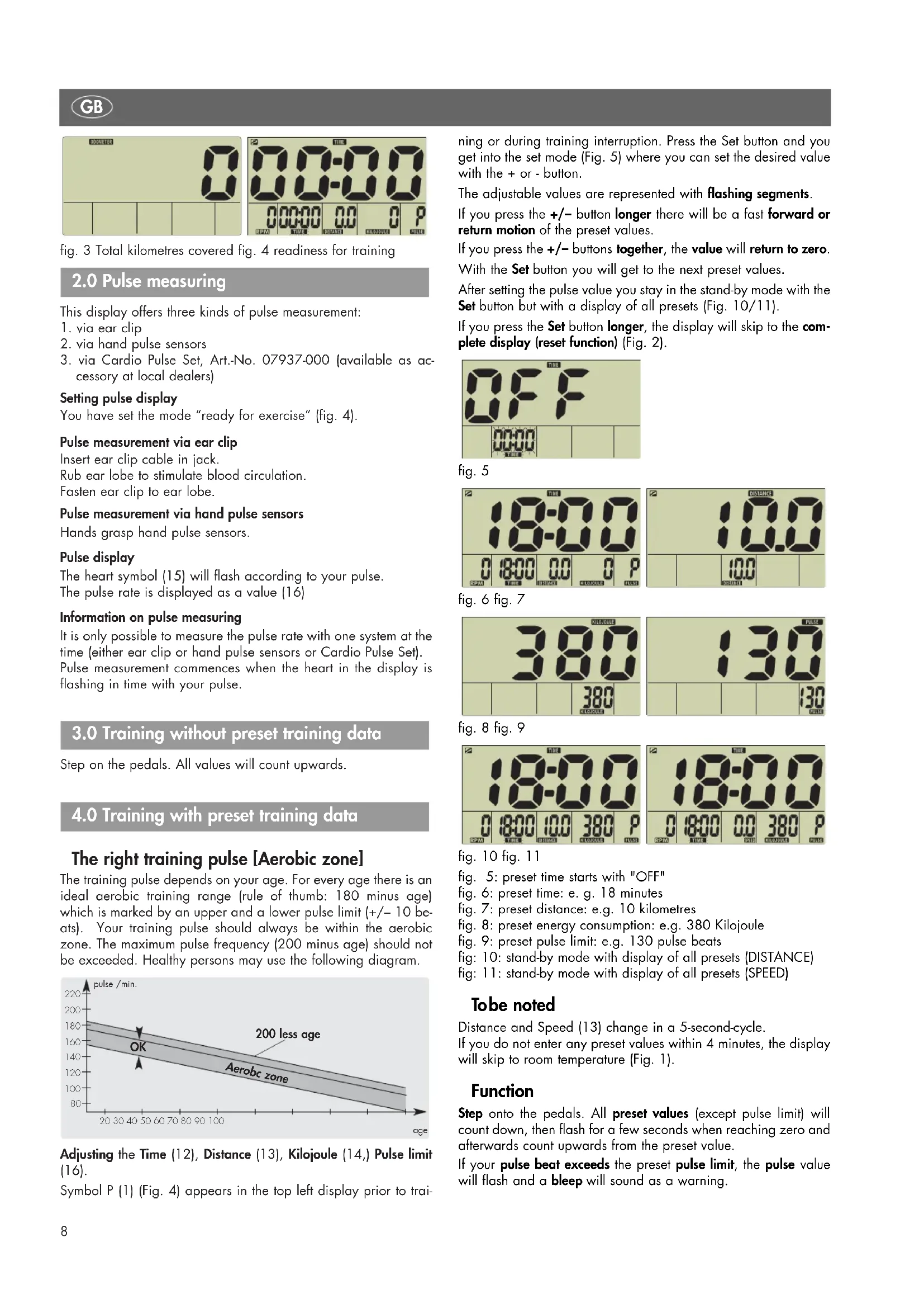 cessory at local dealers) Setting pulse display You have set the mode “ready for exercise” (fig. 4). Pulse measurement via ear clip Insert ear clip cable in jack. Rub ear lobe to stimulate blood circulation. Fasten ear clip to ear lobe. Pulse measurement via hand pulse sensors Hands grasp hand pulse sensors. Pulse display The heart symbol (15) will flash according to your pulse. The pulse rate is displayed as a value (16) Information on pulse measuring It is only possible to measure the pulse rate with one system at the time (either ear clip or hand pulse sensors or Cardio Pulse Set). Pulse measurement commences when the heart in the display is flashing in time with your pulse. Step on the pedals. All values will count upwards. The right training pulse [Aerobic zone] The training pulse depends on your age. For every age there is an ideal aerobic training range (rule of thumb: 180 minus age) which is marked by an upper and a lower pulse limit (+/– 10 be- ats). Your training pulse should always be within the aerobic zone. The maximum pulse frequency (200 minus age) should not be exceeded. Healthy persons may use the following diagram. Adjusting the Time (12), Distance (13), Kilojoule (14,) Pulse limit (16). Symbol P (1) (Fig. 4) appears in the top left display prior to trai- pulse /min.