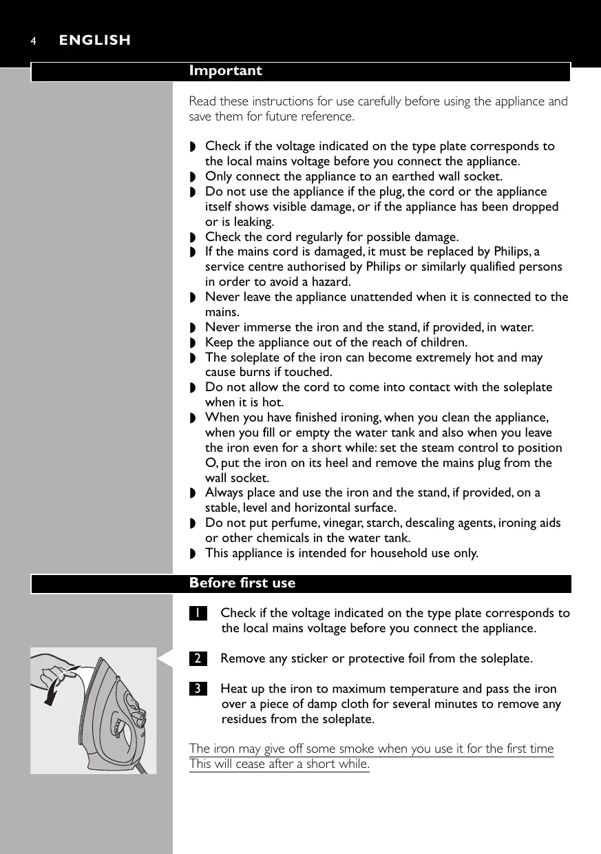 ENGLISH Important Read these instructions for use carefully before using the appliance and save them for future reference. ◗ Check if the voltage indicated on the type plate corresponds to the local mains voltage before you connect the appliance. ◗ Only connect the appliance to an earthed wall socket. ◗ Do not use the appliance if the plug, the cord or the appliance itself shows visible damage, or if the appliance has been dropped or is leaking. ◗ Check the cord regularly for possible damage. ◗ If the mains cord is damaged, it must be replaced by Philips, a service centre authorised by Philips or similarly qualified persons in order to avoid a hazard. ◗ Never leave the appliance unattended when it is connected to the mains. ◗ Never immerse the iron and the stand, if provided, in water. ◗ Keep the appliance out of the reach of children. ◗ The soleplate of the iron can become extremely hot and may cause burns if touched. ◗ Do not allow the cord to come into contact with the soleplate when it is hot. ◗ When you have finished ironing, when you clean the appliance, when you fill or empty the water tank and also when you leave the iron even for a short while: set the steam control to position O, put the iron on its heel and remove the mains plug from the wall socket. ◗ Always place and use the iron and the stand, if provided, on a stable, level and horizontal surface. ◗ Do not put perfume, vinegar, starch, descaling agents, ironing aids or other chemicals in the water tank. ◗ This appliance is intended for household use only. Before first use
