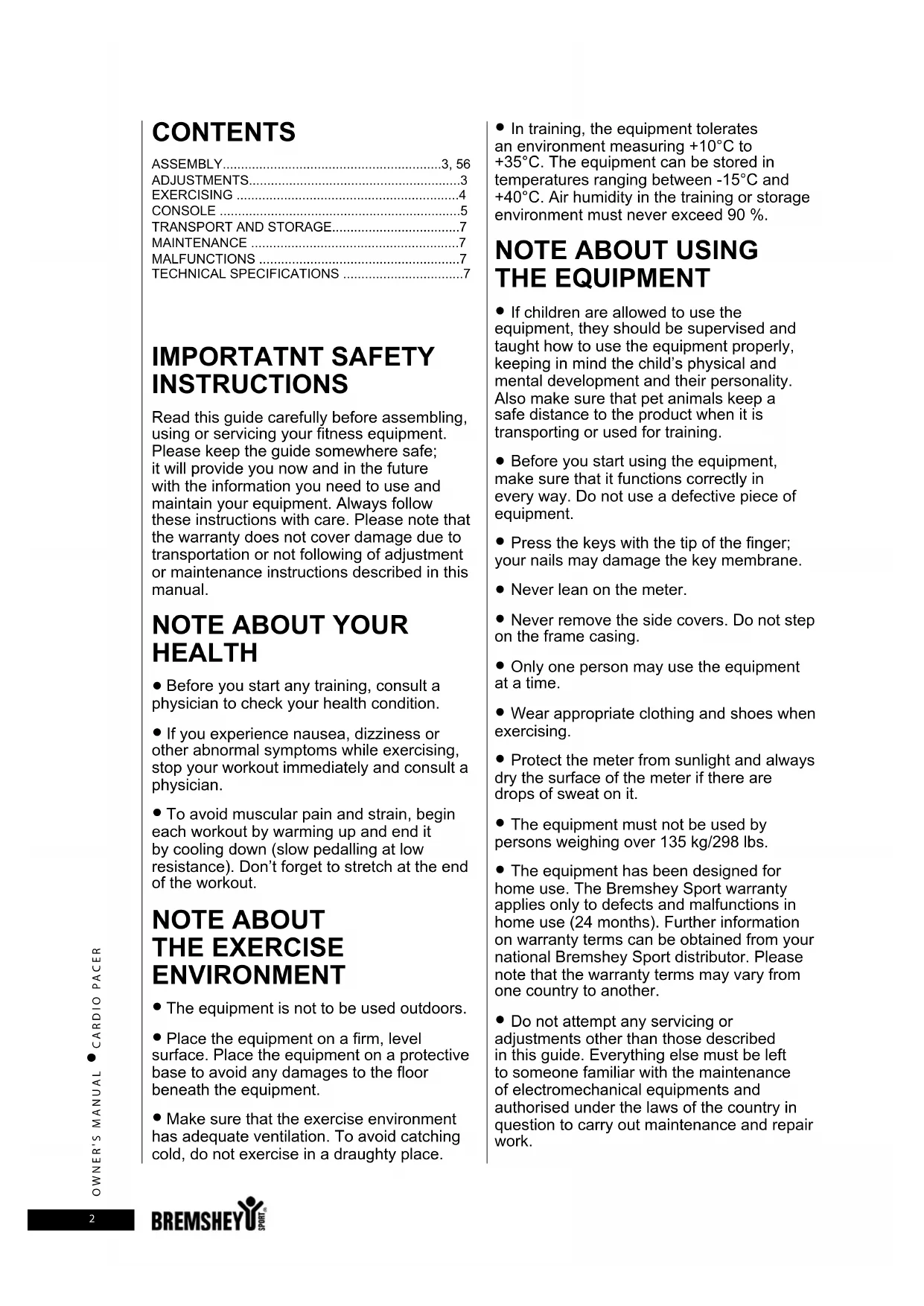 - The equipment has been designed for home use. The Bremshey Sport warranty applies only to defects and malfunctions in home use (24 months). Further information on warranty terms can be obtained from your national Bremshey Sport distributor. Please note that the warranty terms may vary from one country to another.