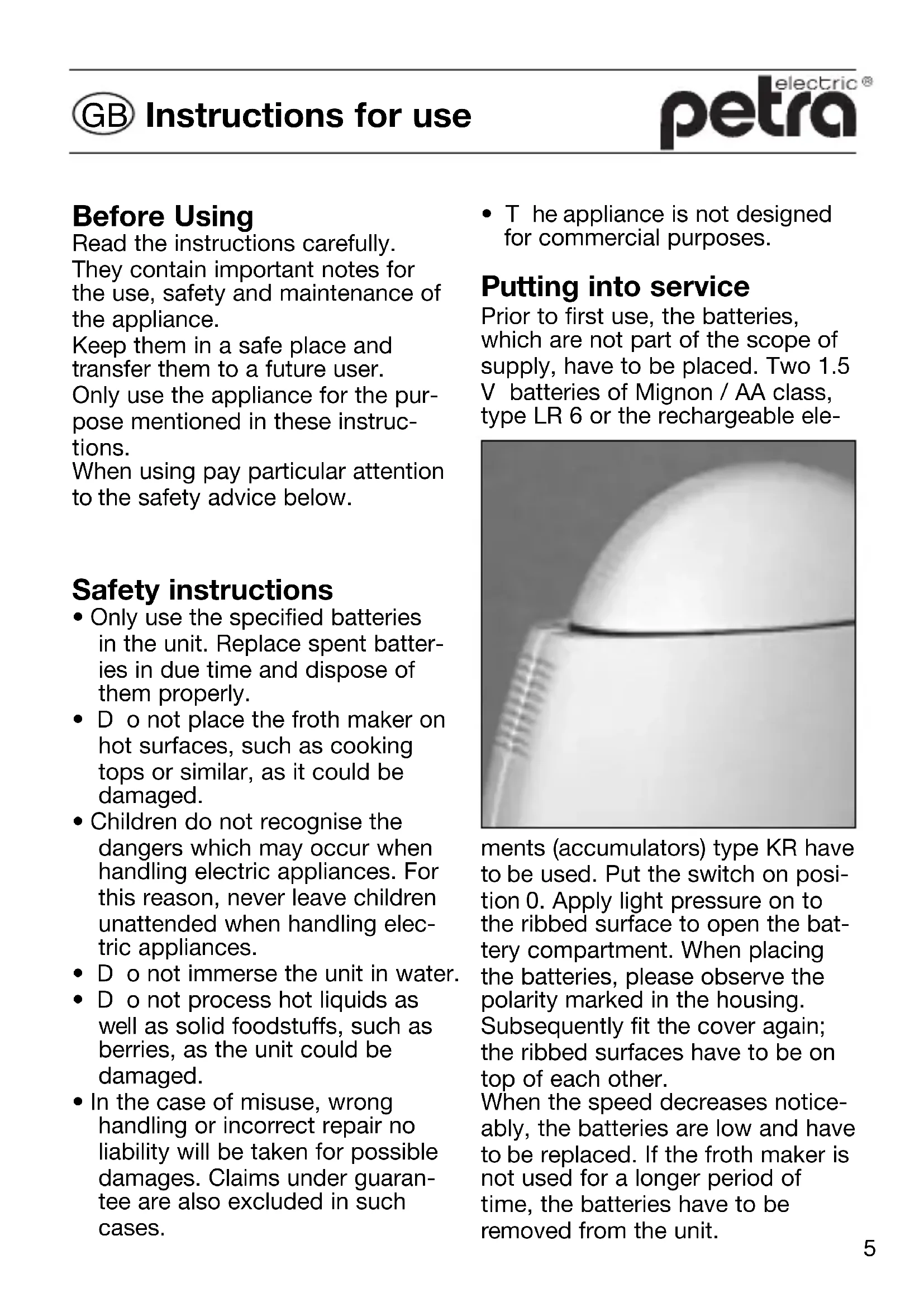 - The appliance is not designed for commercial purposes. Putting into service Prior to first use, the batteries, which are not part of the scope of supply, have to be placed. Two 1.5 V batteries of Mignon / AA class, type LR 6 or the rechargeable ele- ments (accumulators) type KR have to be used. Put the switch on posi- tion 0. Apply light pressure on to the ribbed surface to open the bat- tery compartment. When placing the batteries, please observe the polarity marked in the housing. Subsequently fit the cover again; the ribbed surfaces have to be on top of each other. When the speed decreases notice- ably, the batteries are low and have to be replaced. If the froth maker is not used for a longer period of time, the batteries have to be removed from the unit.