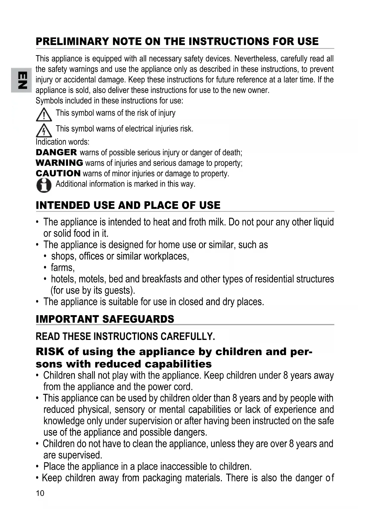 RISK of using the appliance by children and persons with reduced capabilities