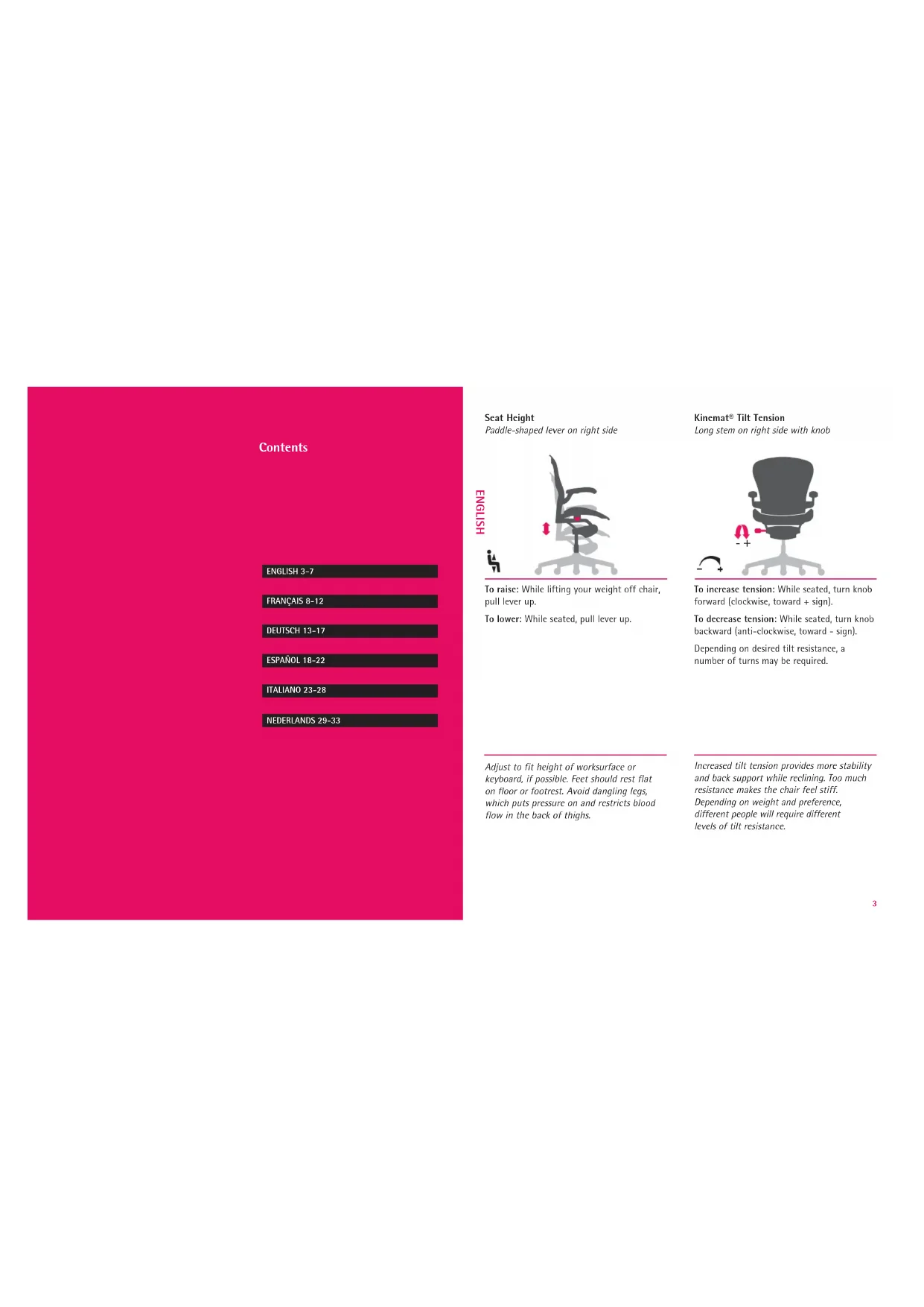Normally, forward tilt position is used with increased chair height. This relaxes the bend of your waist, knees, and ankles. To support back, set tilt limiter after assuming forward position.