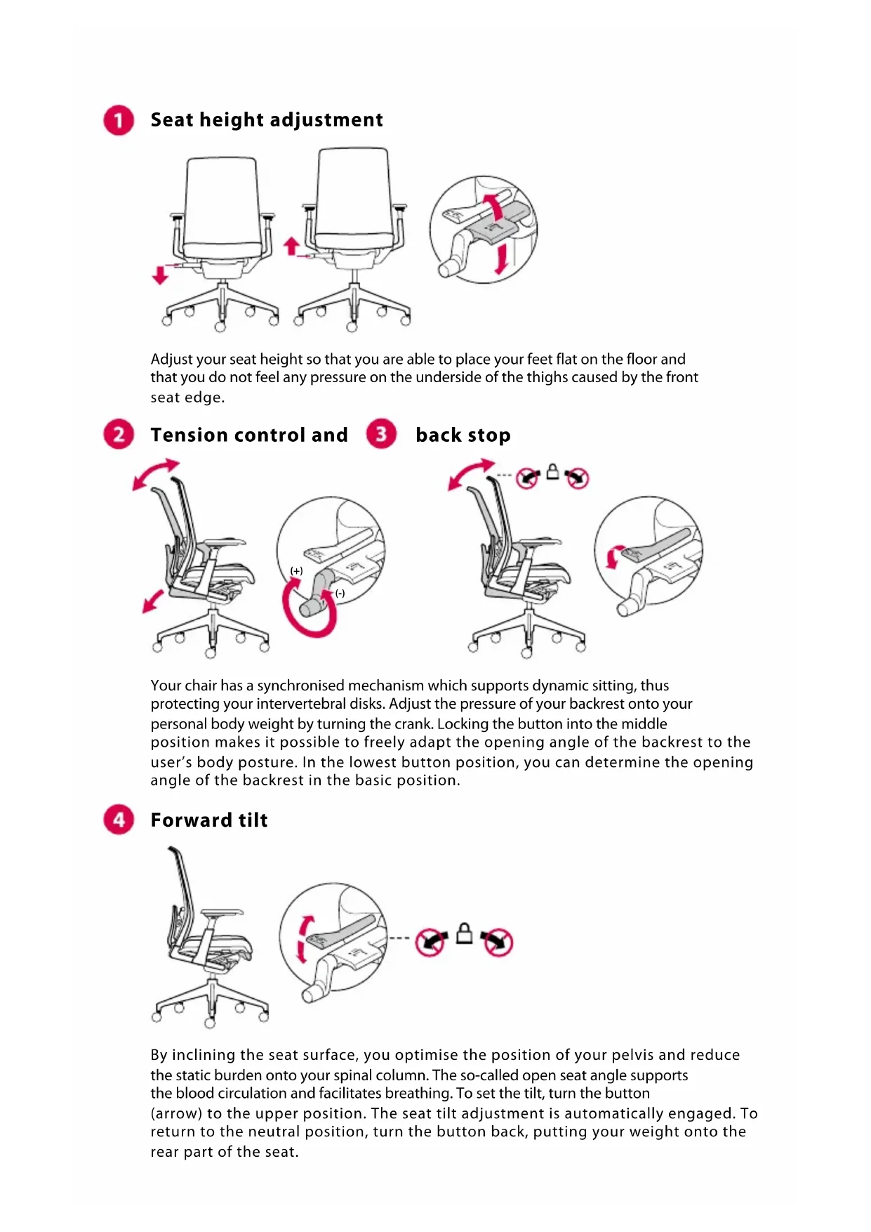 Your chair has a synchronised mechanism which supports dynamic sitting, thus protecting your intervertebral disks. Adjust the pressure of your backrest onto your personal body weight by turning the crank. Locking the button into the middle position makes it possible to freely adapt the opening angle of the backrest to the user's body posture. In the lowest button position, you can determine the opening angle of the backrest in the basic position.
