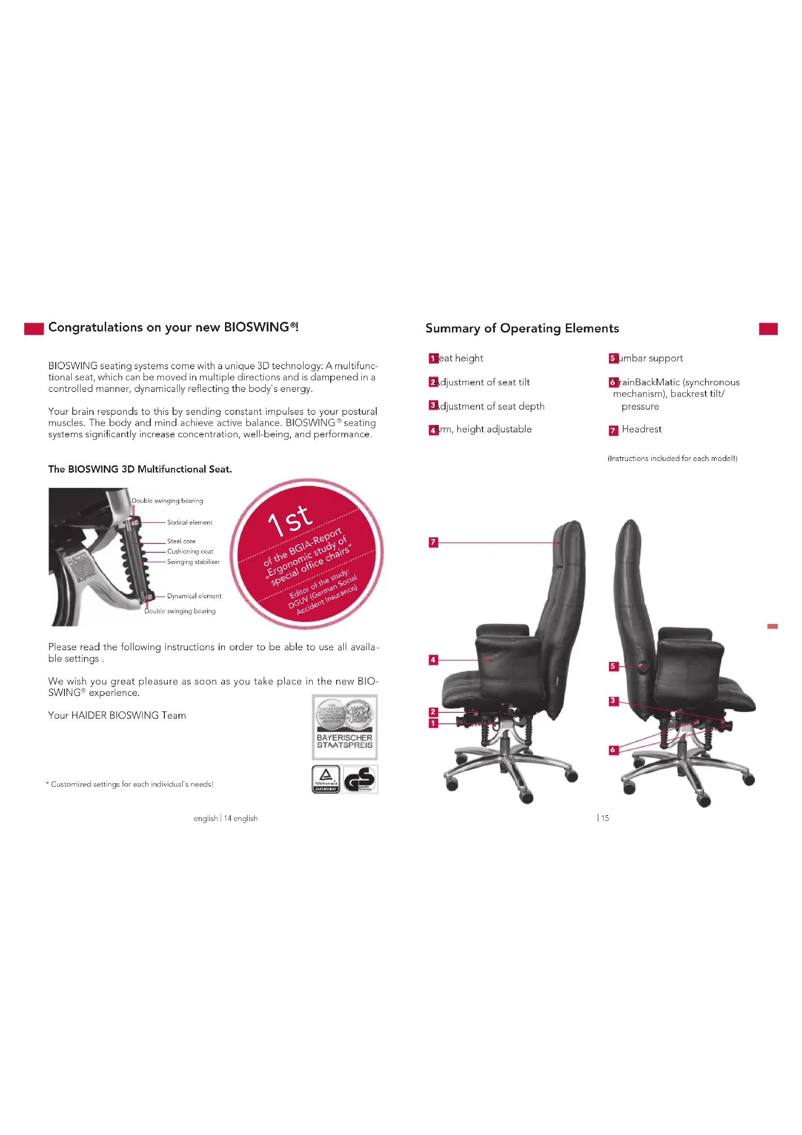 1st of the BGIA-Report "Ergonomic study of special office chairs" Editor of the study: DGUV (German Social Accident Insurance)Please read the following instructions in order to be able to use all available settings.