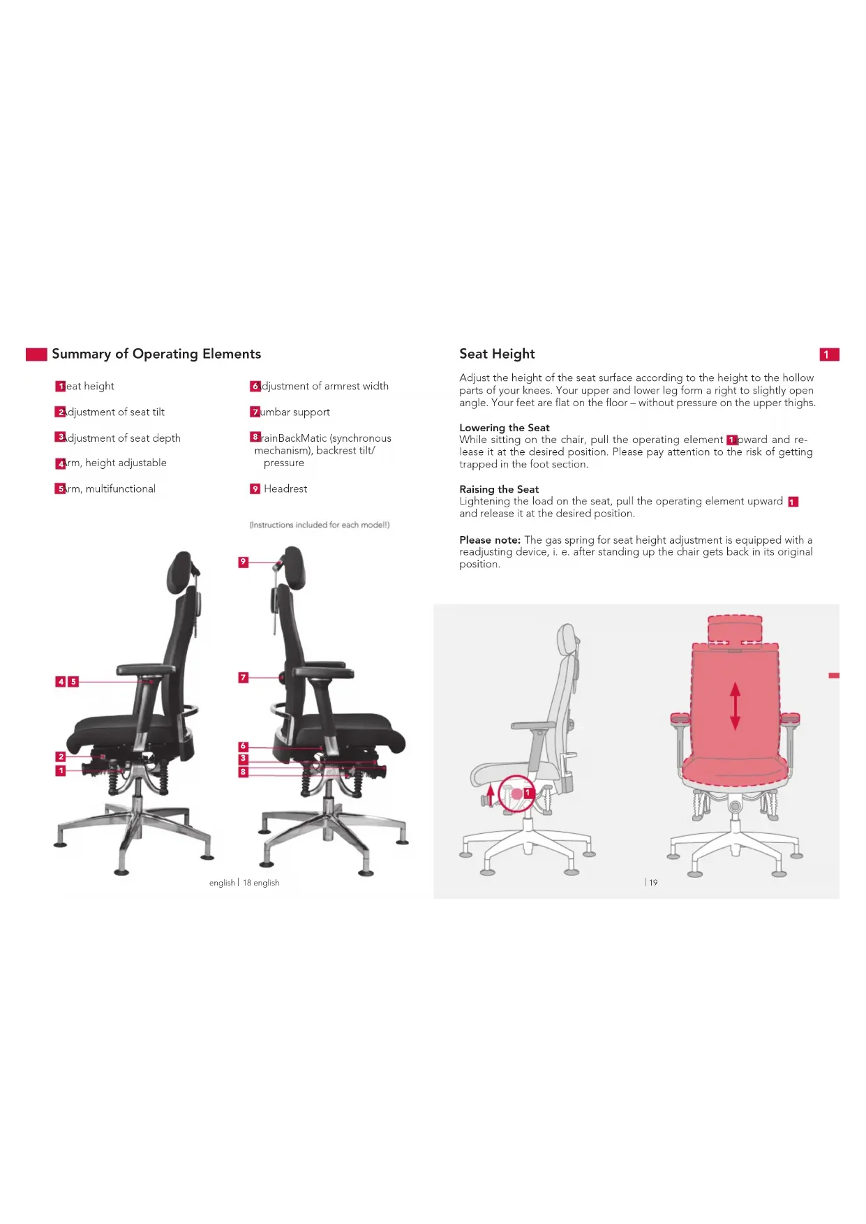 Please note: The gas spring for seat height adjustment is equipped with a readjusting device, i. e. after standing up the chair gets back in its original position.