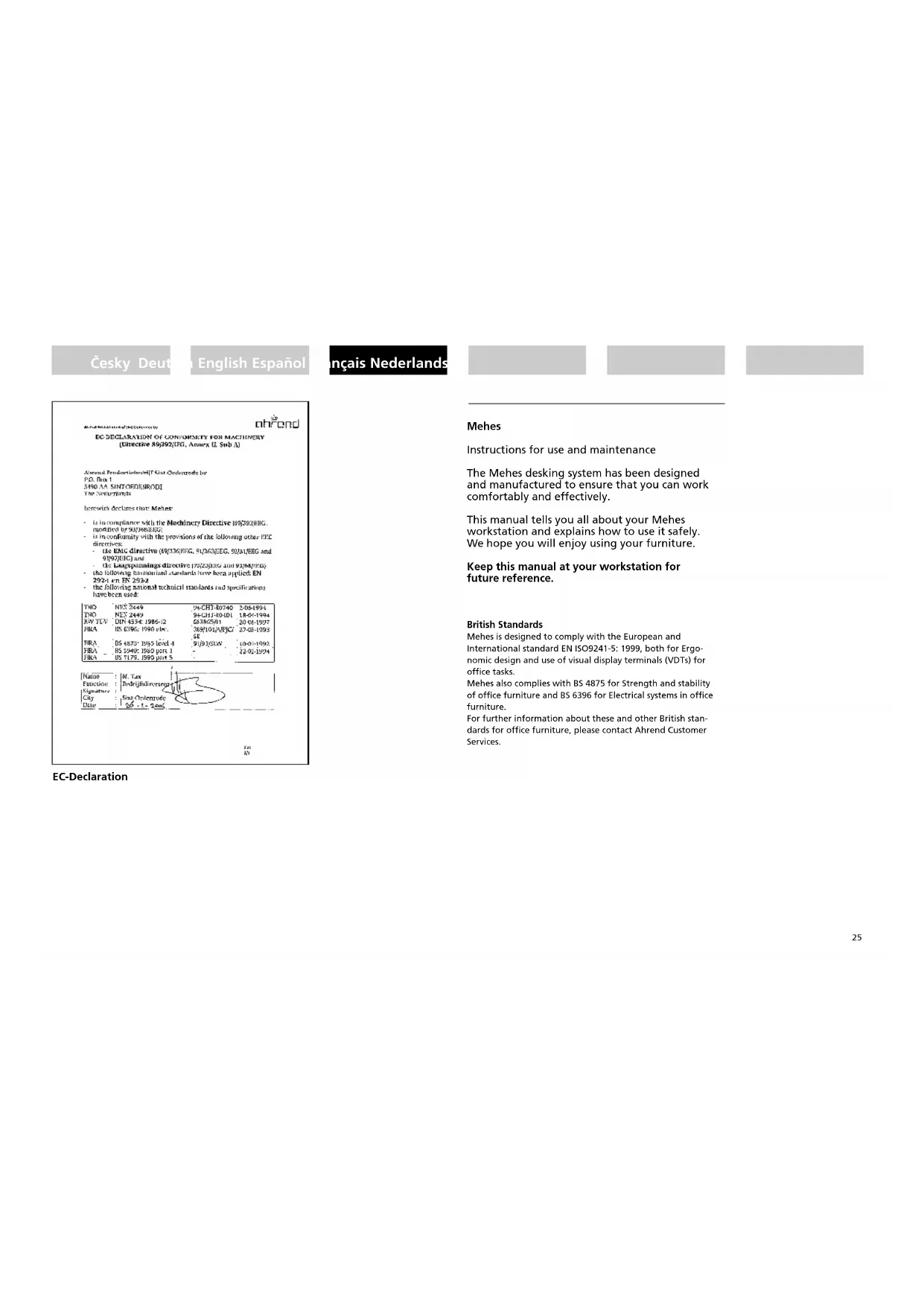 Mehes is designed to comply with the European and International standard EN ISO9241-5: 1999, both for Ergonomic design and use of visual display terminals (VDTs) for office tasks. Mehes also complies with BS 4875 for Strength and stability of office furniture and BS 6396 for Electrical systems in office furniture. For further information about these and other British standards for office furniture, please contact Ahrend Customer Services.