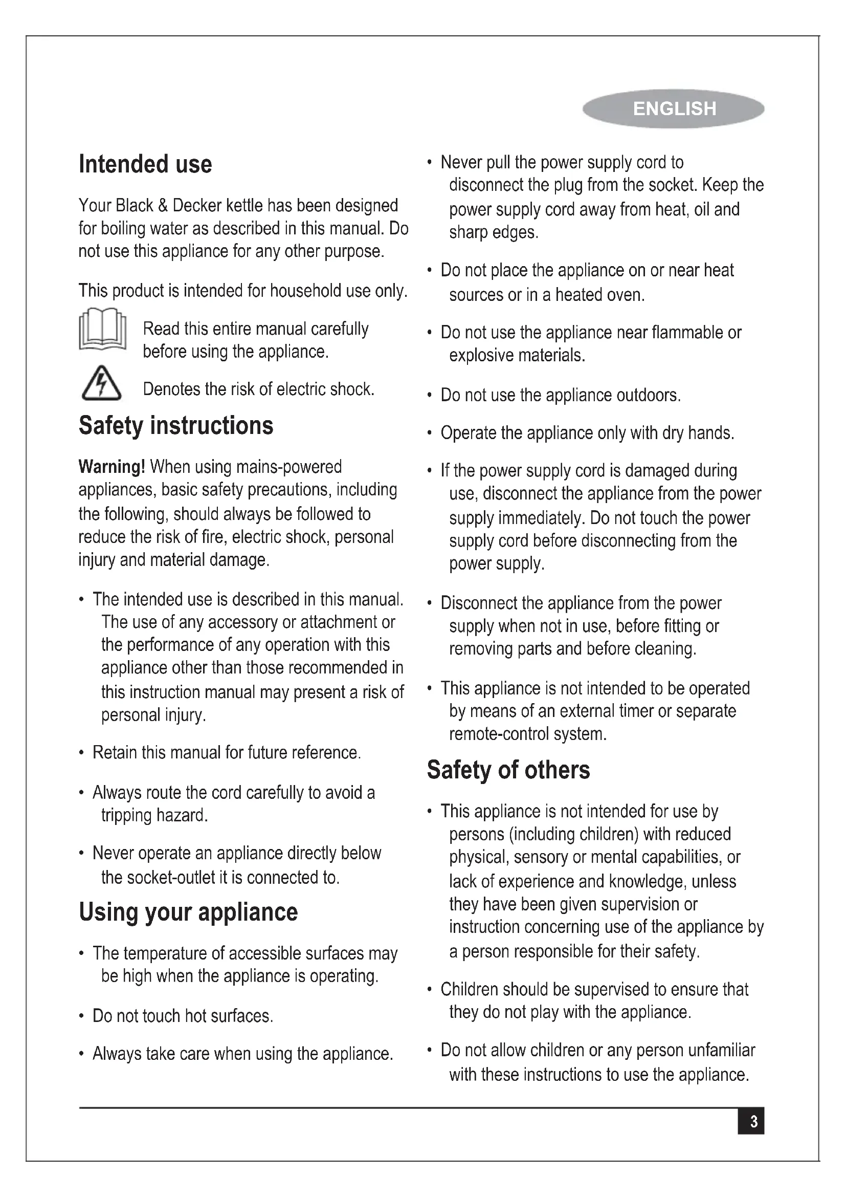 ENGLISH Intended use Your Black & Decker kettle has been designed for boiling water as described in this manual. Do not use this appliance for any other purpose. This product is intended for household use only. Read this entire manual carefully before using the appliance. Denotes the risk of electric shock. Safety instructions Warning! When using mains-powered appliances, basic safety precautions, including the following, should always be followed to reduce the risk of fire, electric shock, personal injury and material damage.